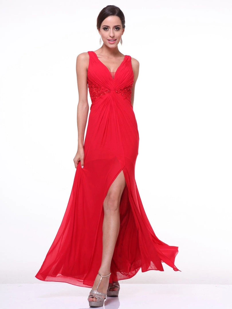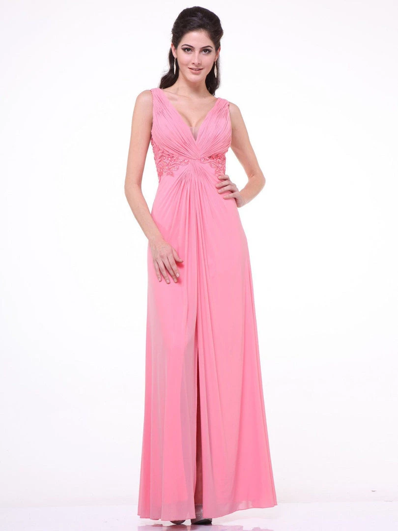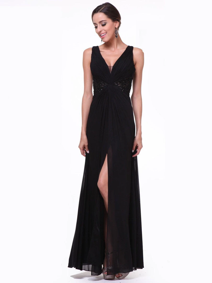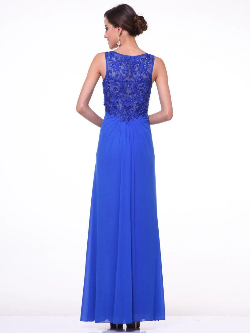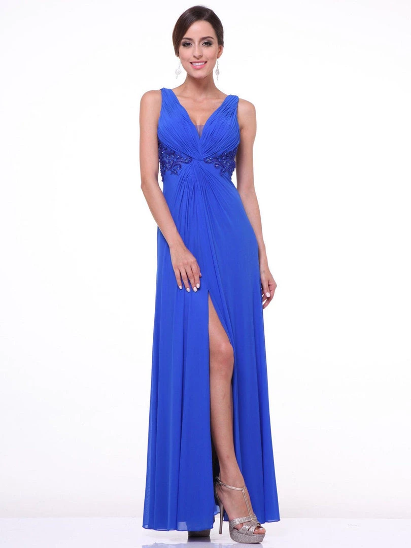 Make a grand entrance in this twist front long dress by Cinderella Divine 73. Twisted bodice with detailed beading and embroidery detail the sheer back and around the waist. Elegant length with high split for fun, seductive evening look.