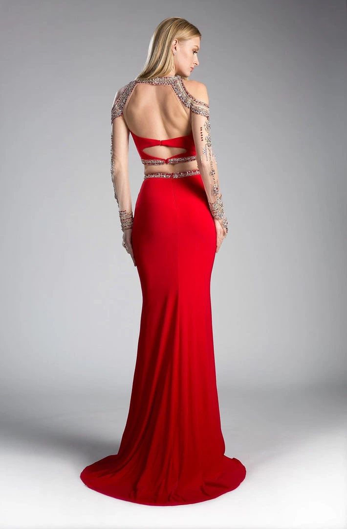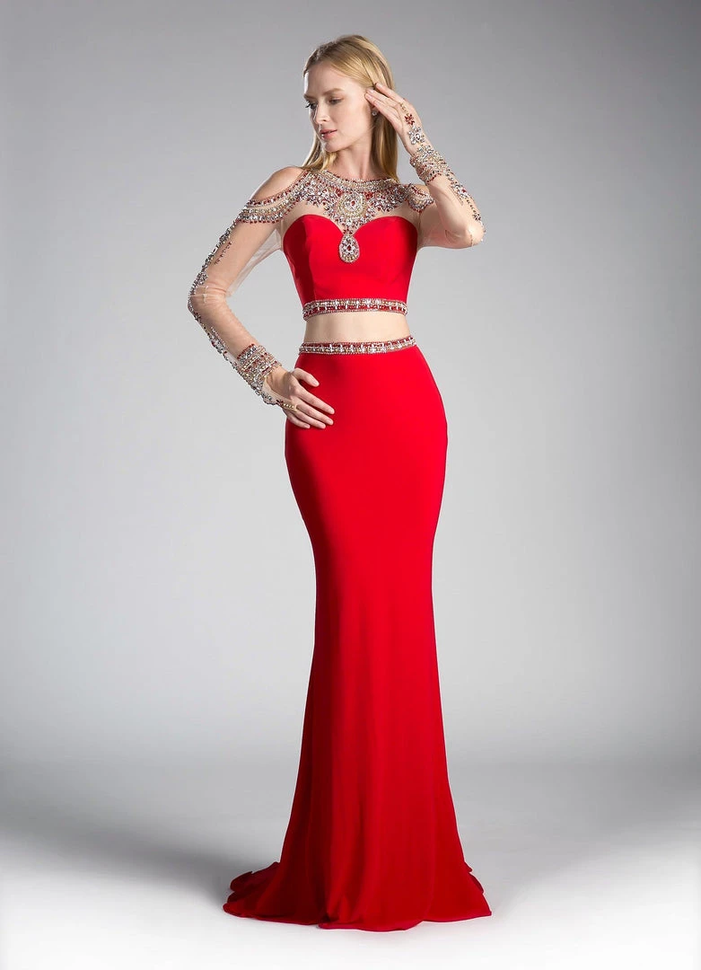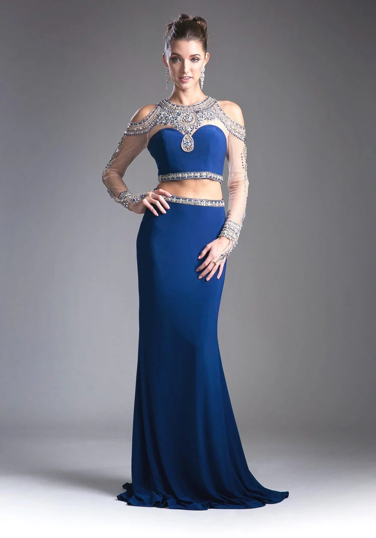 Look unforgettable in thisĀ long beaded two-piece dress with sheer sleeves by Cinderella Divine 71486. This evening gown features a sweetheart cold shoulder crop top with a dazzling beaded design, the sheer sleeves is adorned with rhinestones and features a unique finger-less style, sheer embellished back with a flirty cut out, a floor length fit and flare skirt with small train, and a zipper closure.