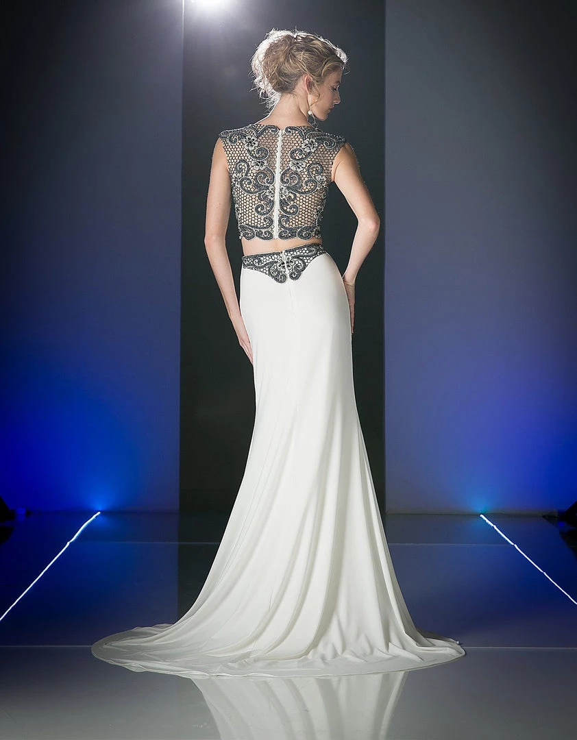 Command attention in this long ivory two piece dress by Cinderella Divine J755. This two-piece evening dress features princess scoop neckline with bead work that is created to look like lace applique. The chiffon skirt is full and falls into a court train.
