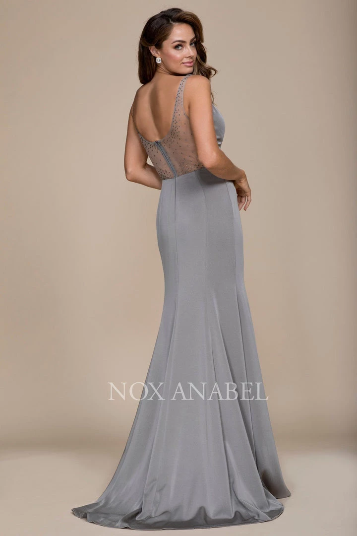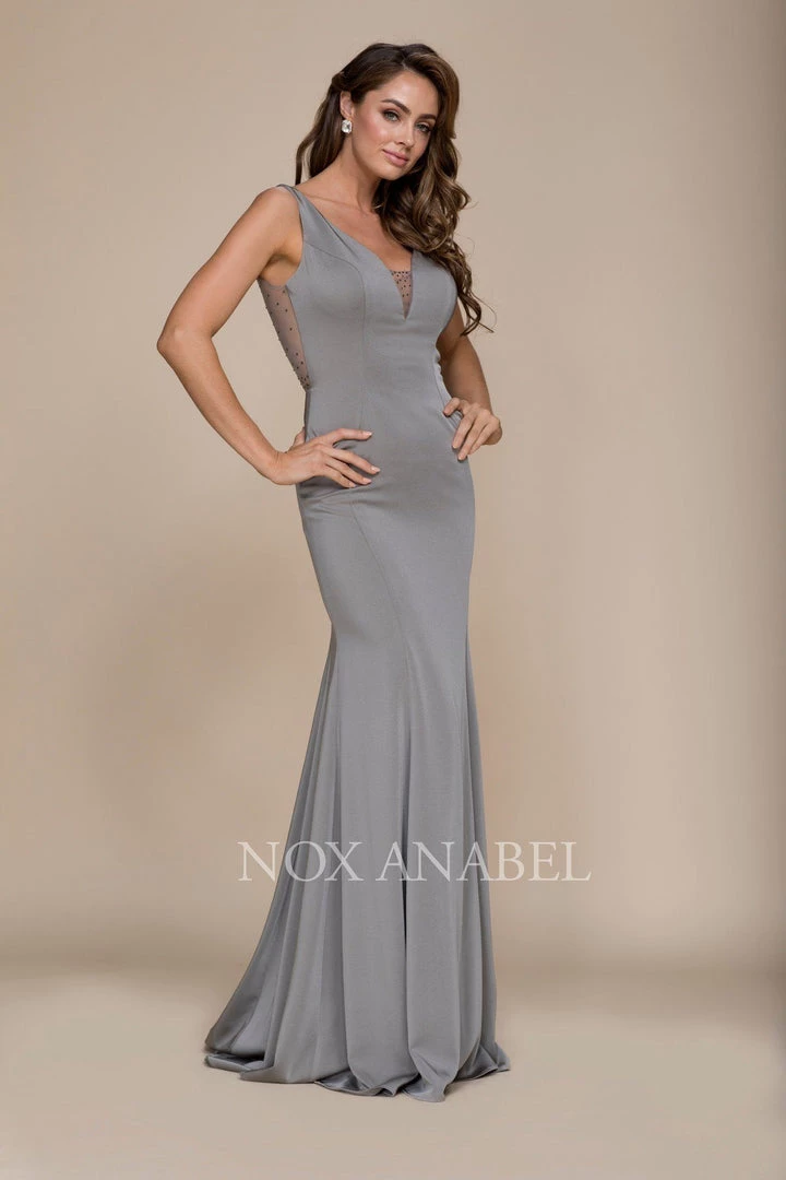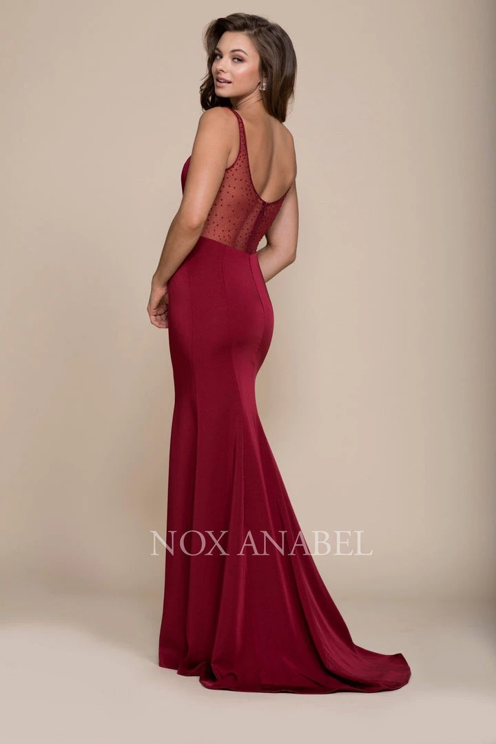 Look picture-perfect in this V-neck illusion back gown by Nox Anabel C001. This evening dress features a deep V-neck bodice anchored with a sheer panel accented with rhinestones, eye-catching open back with beaded sheer mesh, a full length A-line skirt that flares to the floor forming a small train, and a zipper closure. Affordably priced under $200, this dress is perfect for any formal event and will keep you on budget!