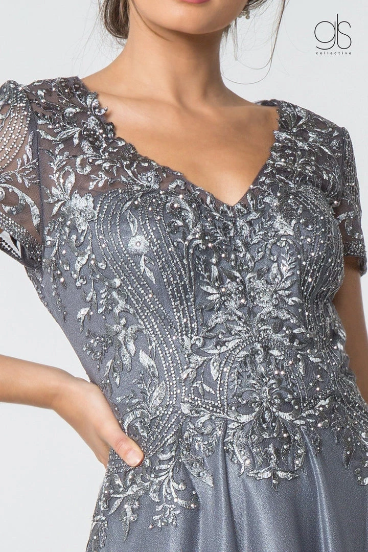Look radiant in this floral lace bodice V-neck gown with short sleeves by Elizabeth K GL2829.