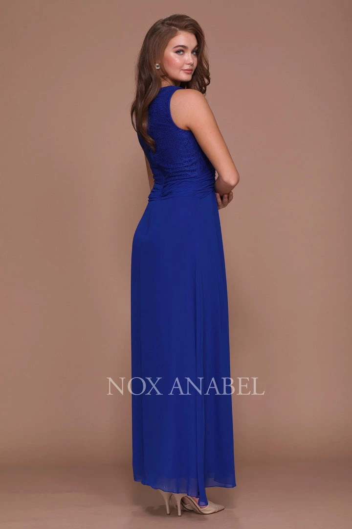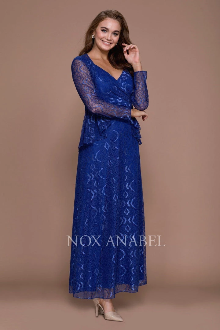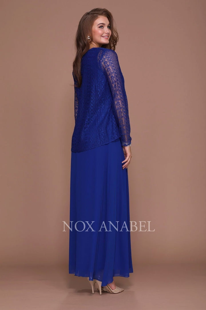 Fall in love with this long sleeveless lace dress with long-sleeved jacket by Nox Anabel Style Number 5140. This long evening gown features a V-neck sleeveless bodice with beautiful lace all over, V-shaped back, full length skirt, matching lace jacket, and a zipper closure. Perfect as a Mother of the Bride dress or for any formal event!