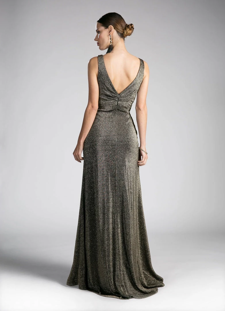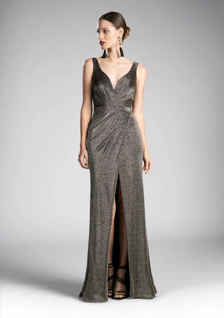 Look stunning in this long sleeveless V-neck metallic dress with side slit by Cinderella Divine CH551. Made out of shimmery fabric, this evening gown features a ruched sleeveless V-neck bodice with a sheer inset panel, floor length fitted skirt with side slit, and a zipper closure.