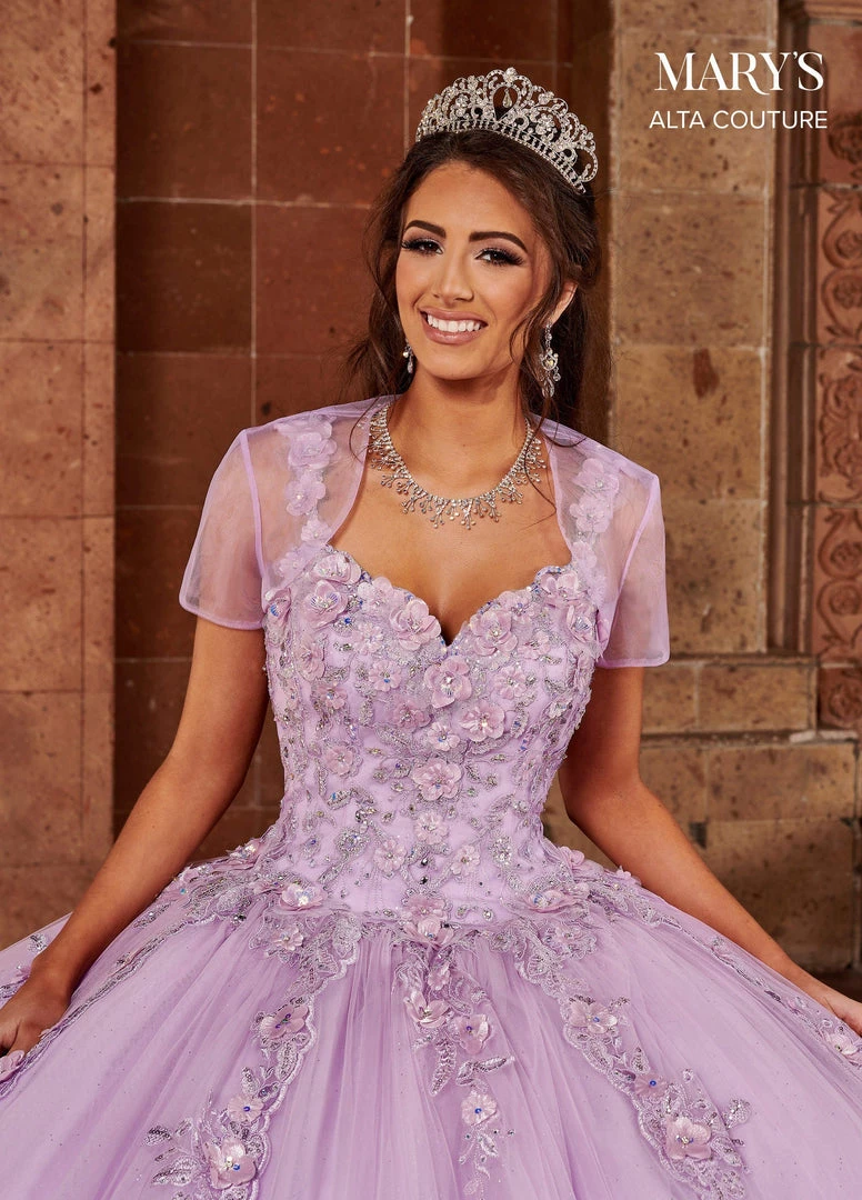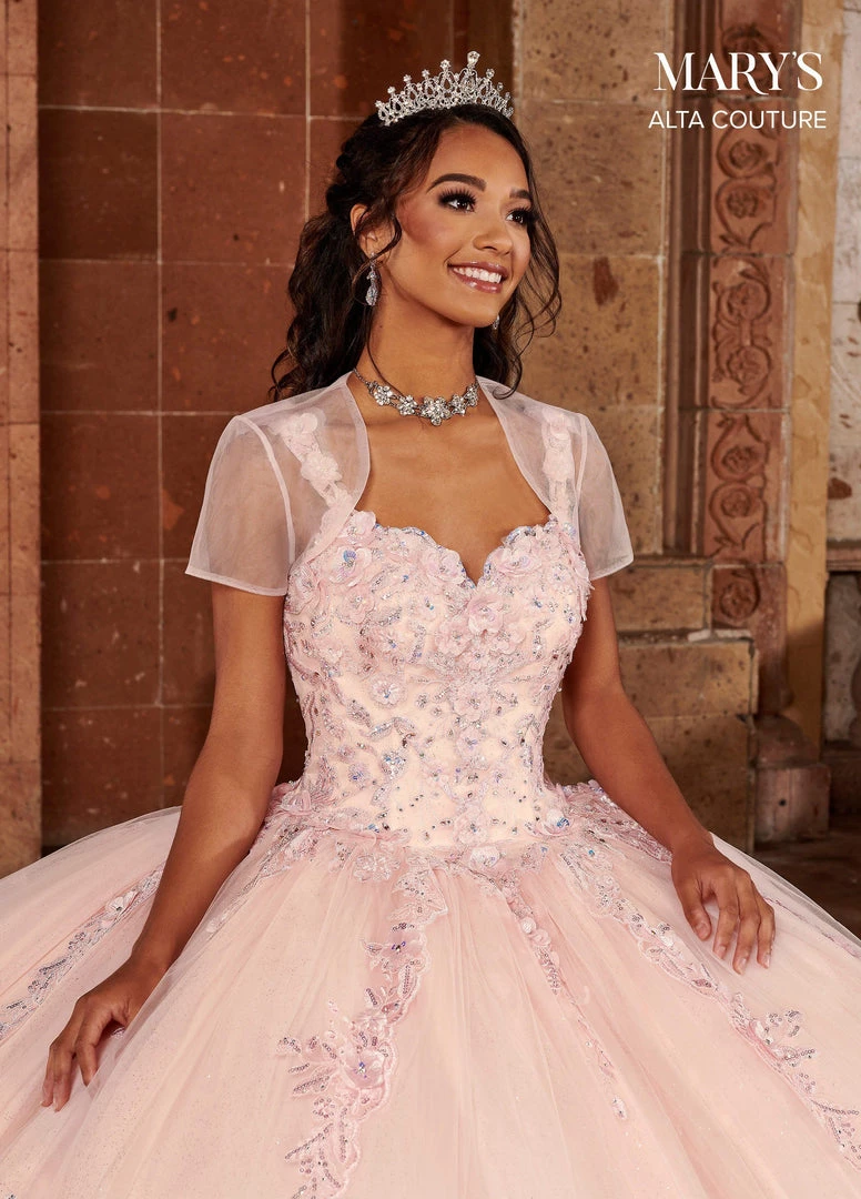 Be selfie ready in this 3D floral applique long sleeveless dress with A-line skirt by Mary’s Bridal Alta Couture MQ3069. Floral embroidered tulle ball gown with a sweetheart neckline and detachable sleeves. The gown is accented throughout with delicate floral embroidery, 3-dimensional flowers and sparkling stones. The gown finishes with a corset back and sweep train. The matching bolero jacket is included.
