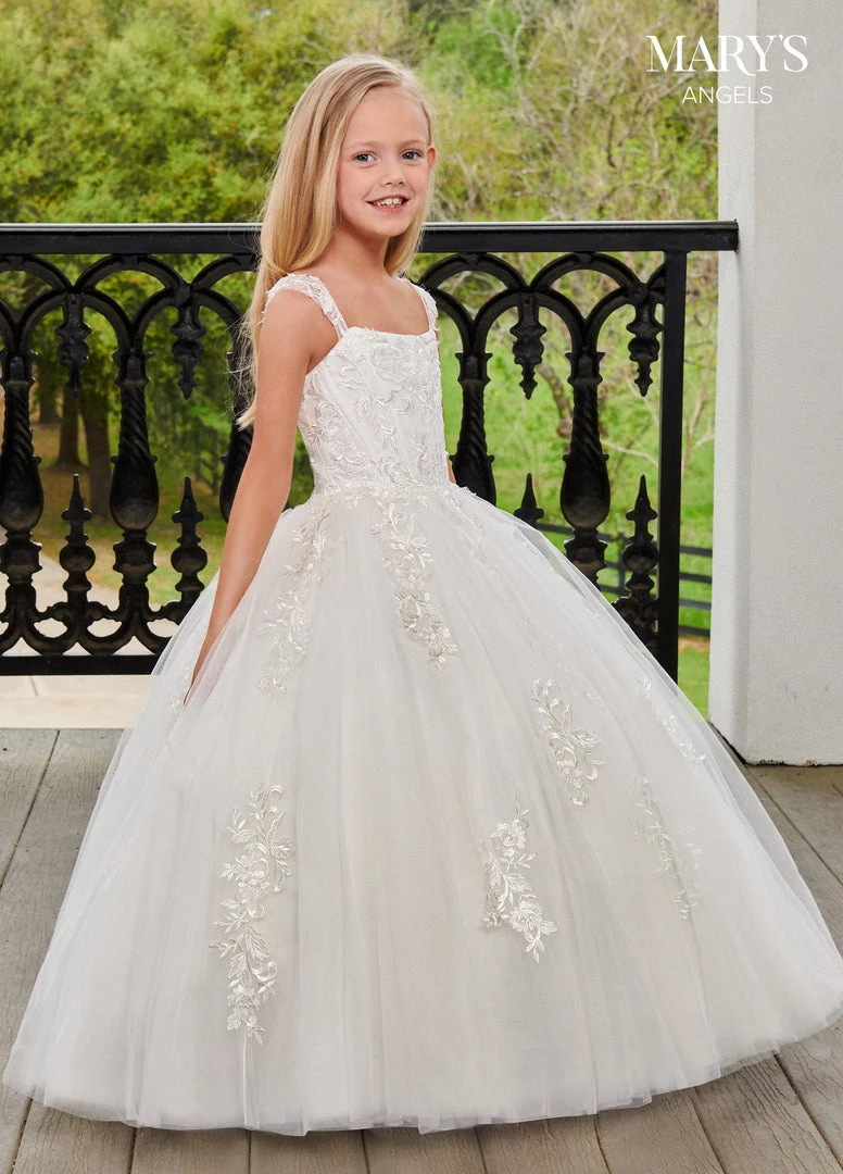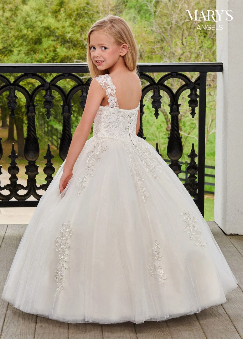 Your sweet girl will love twirling in this long sleeveless tulle dress with A-line skirt by Mary’s Angels MB9100. This tulle ball gown features a scoop neck line, corset bodice, illusion straps, lace applique, and lace-up back closure.