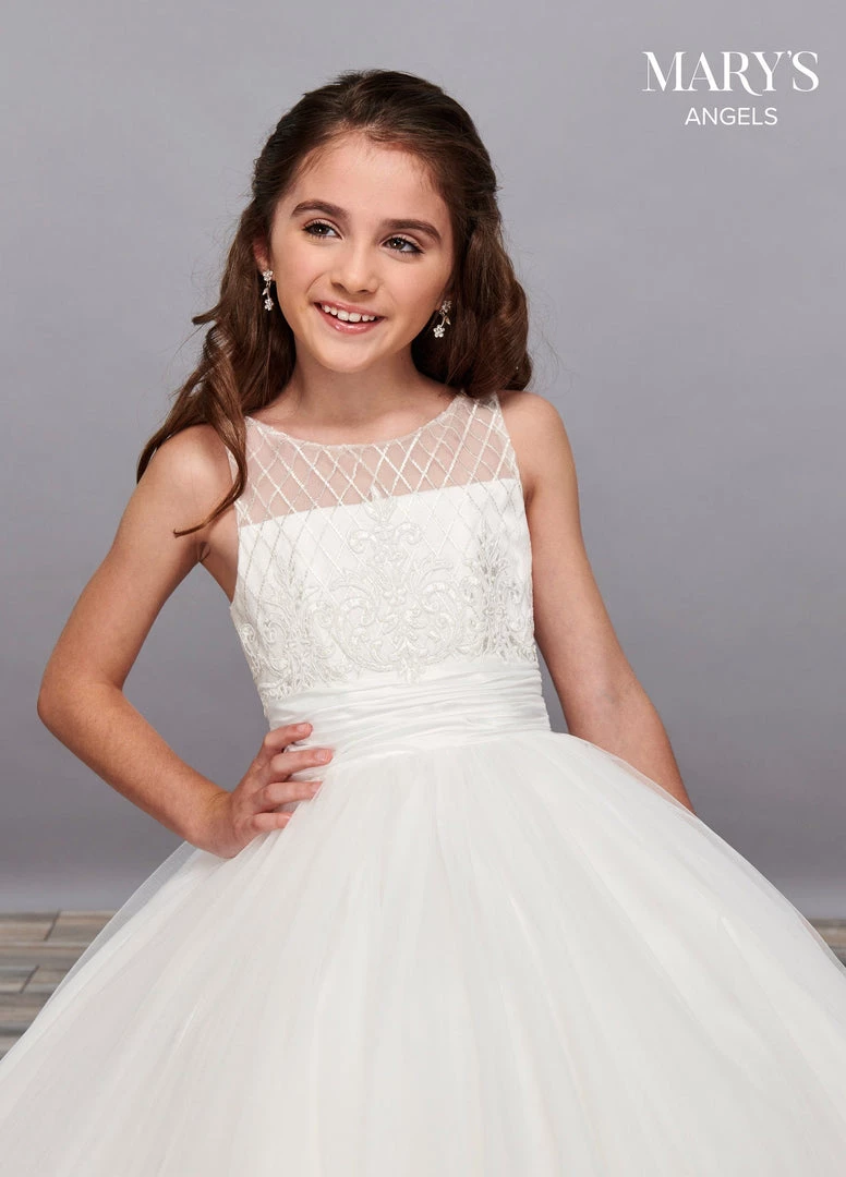 Your sweet girl will look radiant in this embroidered long illusion dress with A-line skirt by Mary’s Angels MB9055. Floor length tulle flower girl dress with a sleeveless bodice, geometric lace underlay and soft lace applique detailing at the bodice and hem. The gown finishes with a back keyhole and lace up back closure.