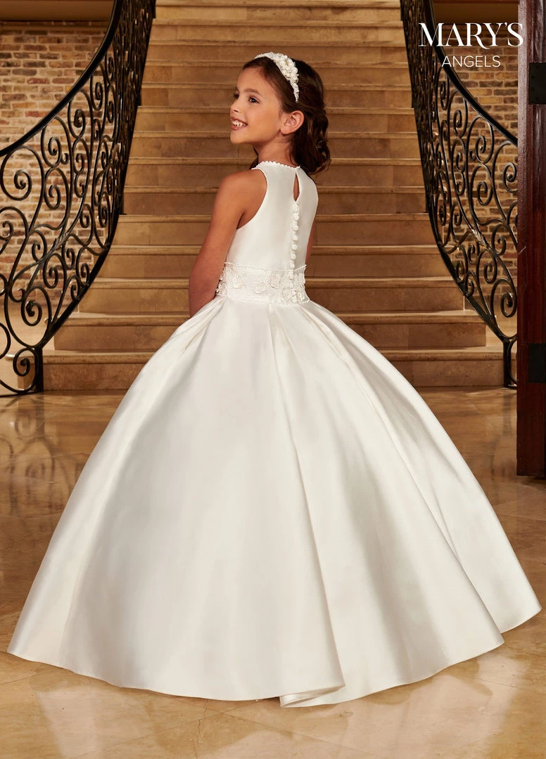 Your sweet girl is sure to receive lots of compliments in this long sleeveless mikado dress with A-line skirt by Mary’s Angels MB9087. Mikado flower girl ball gown with a round neckline, pleated skirt with side pockets, lace appliques, 3D flowers, beading, keyhole back, button detail, and a zipper closure.