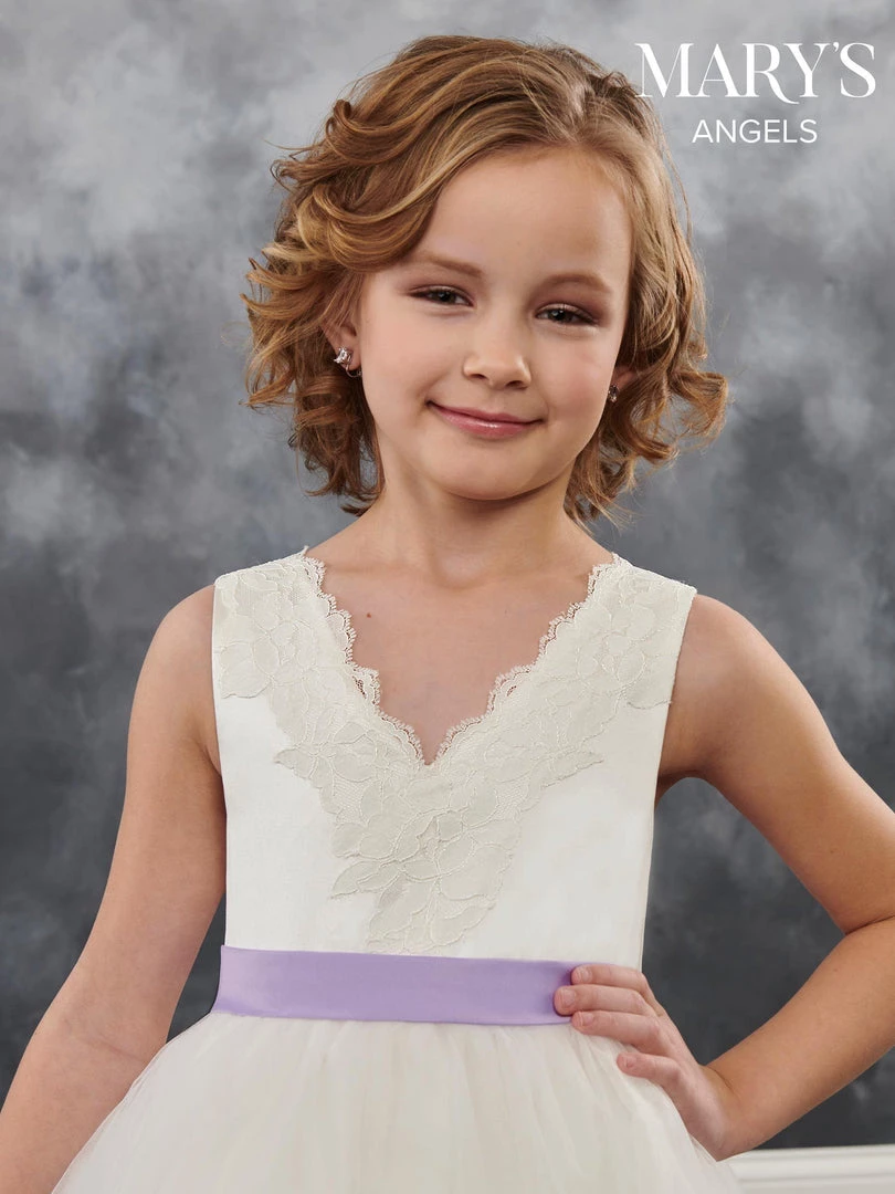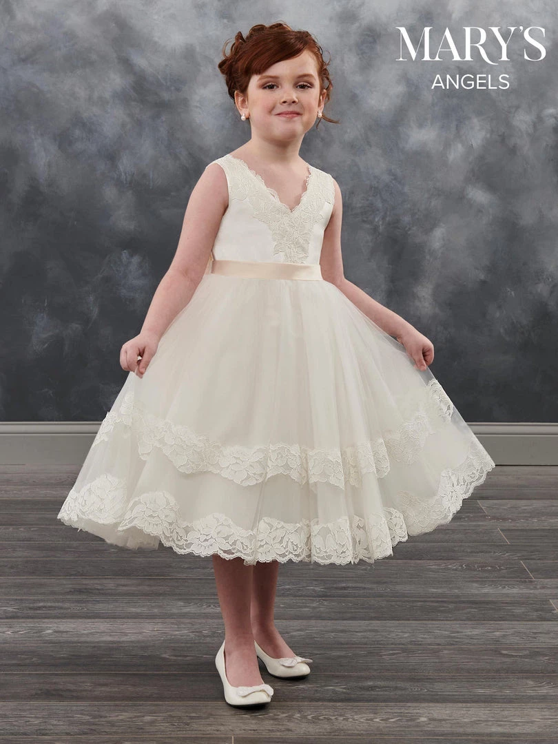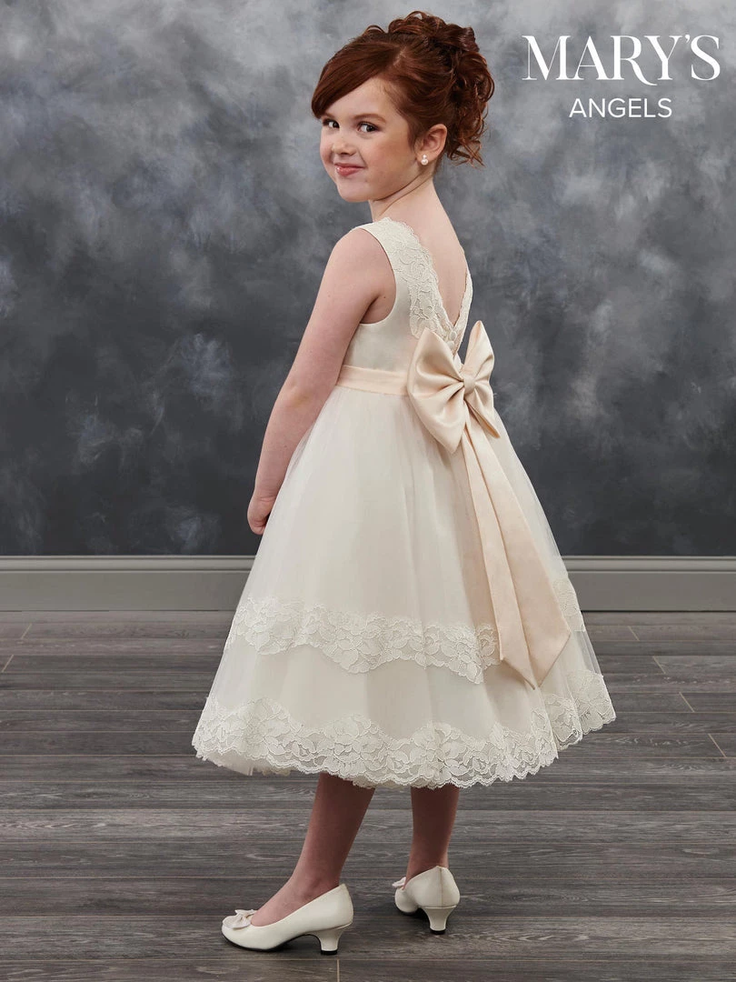 Your sweet girl will be selfie ready in this lace trimmed sleeveless tea length dress with A-line skirt by Mary’s Angels MB9018. Tea length tulle and lace flower girl ball gown features V-neck, V-back, and satin sash with bow.