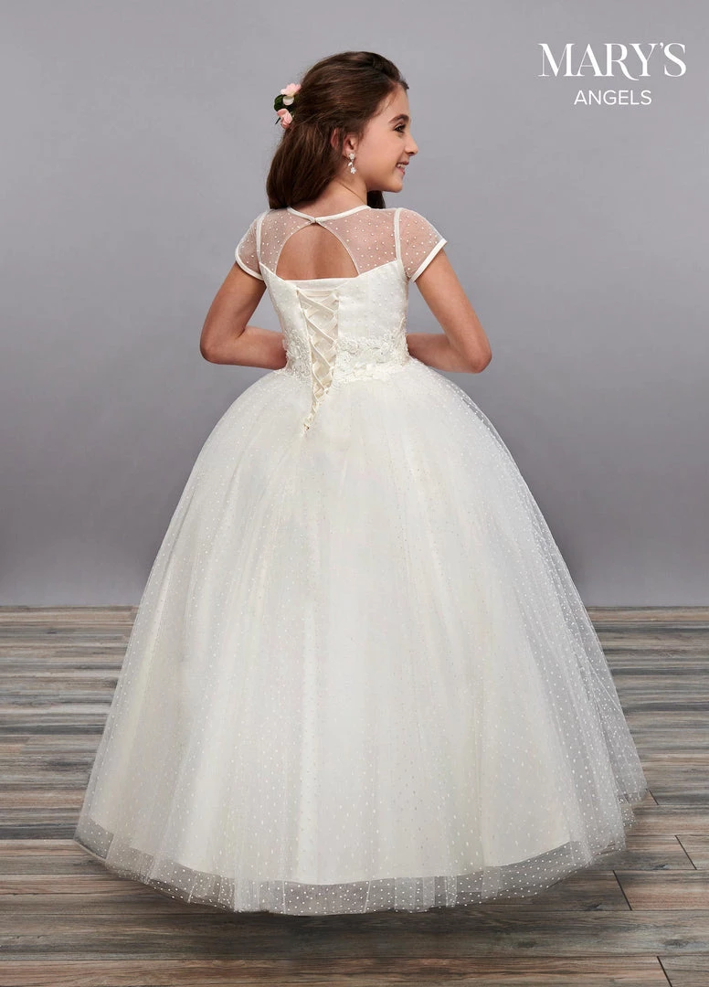 Your sweet girl will receive lots of compliments in this cap sleeve long Swiss dot dress with A-line skirt by Mary’s Angels MB9064. Floor length Swiss dot flower girl dress with a sheer scooped neckline, cap sleeves with satin piping and full floor length skirt. The gown finishes with a lace up back closure.