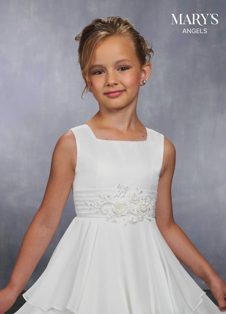 Your sweet girl will look timeless in this long sleeveless chiffon dress with A-line tiered skirt by Mary’s Angels MB9031. Chiffon flower girl dress with sleeveless square neck bodice embellished with beads and 3D flowers, pleated natural waistline, 3-tiered skirt, and a bow attached to the open back with cutout.