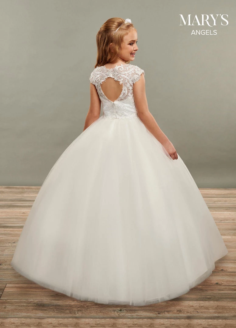 Your sweet girl will look timeless in this short-sleeved long lace applique dress with A-line tulle skirt by Mary’s Angels MB9069. Delightful tulle flower girl dress with a lace applique short sleeve illusion bodice, full A-line skirt, open keyhole back, and a zipper closure.