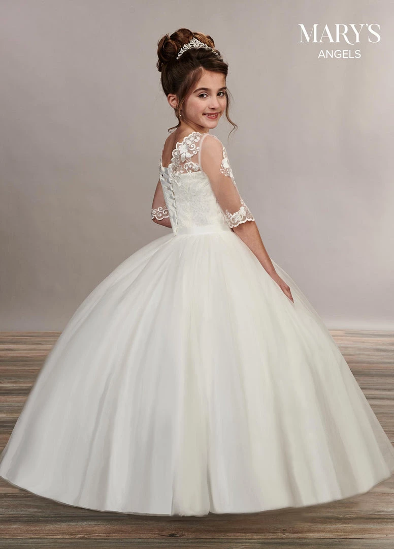 Your sweet girl will look picture-perfect in this mid-length sleeve long lace bodice dress with A-line skirt by Mary’s Angels MB9048. Tulle flower girl dress with a lace applique bodice, sheer illusion neckline, and elbow length sleeves. The gown finishes with a lace up back closure.