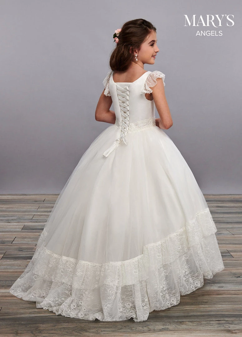 Your sweet girl will look timeless in this ruffled cap sleeve long lace dress with A-line skirt by Mary’s Angels MB9062. Lace and tulle flower girl dress with a satin bodice, ruffled lace cap sleeves, matching lace trim at the waist and a whimsical ruffled lace floor length skirt. The gown finishes with a lace up back closure.