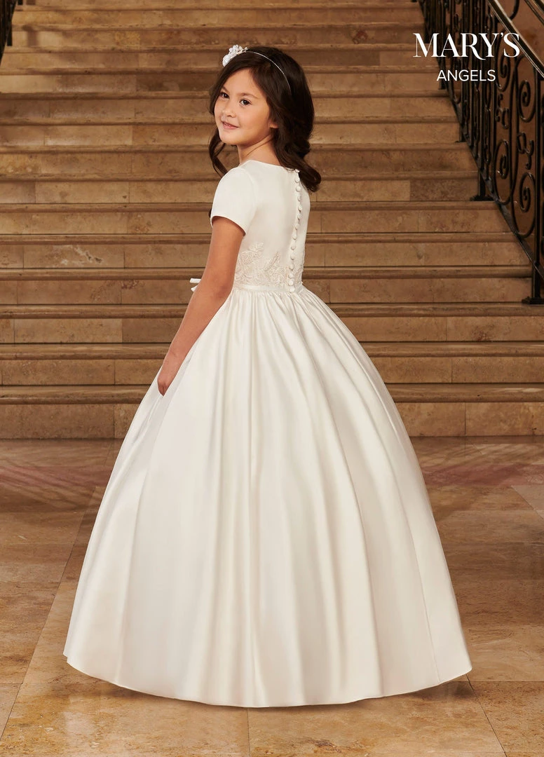 Your sweet girl will look modest chic in this long short sleeved satin dress with A-line skirt by Mary’s Angels MB9077. Charming satin flower girl dress with soft cap sleeves, a round neckline and a back button up closure. A floor length skirt and satin bow on the waistline finish the gown.