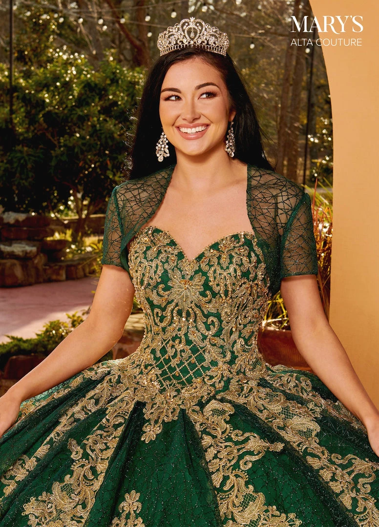 Make a grand entrance in this regal glitter tulle long sleeveless dress with A-line skirt by Mary’s Bridal Alta Couture MQ3091. This glitter tulle ball gown features a beaded sweetheart neck line, detachable beaded double straps, applique, beading, scallop sweep train, and detachable royal scallop train. Matching bolero jacket is included.