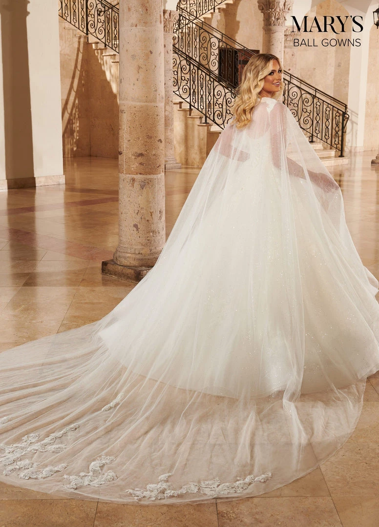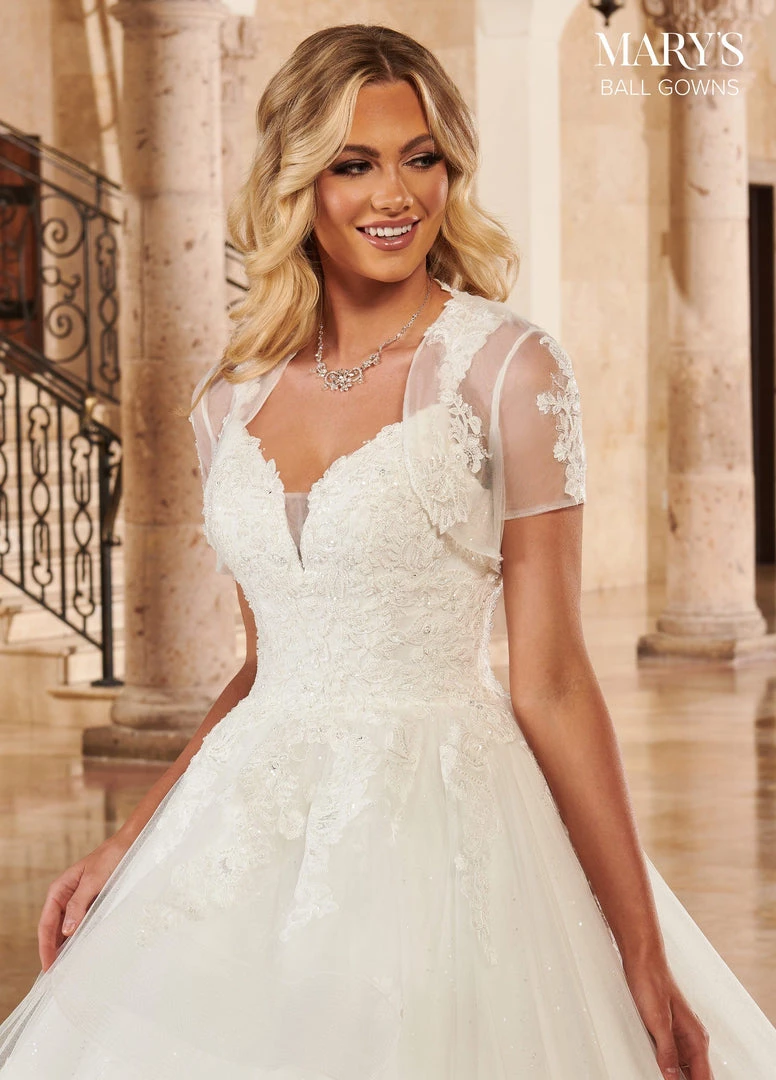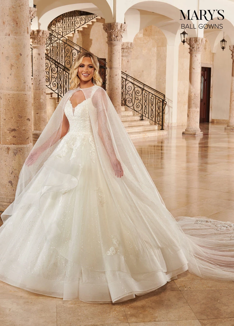 Captivate the room in this sleeveless glitter cape wedding dress by Mary’s Bridal Ball Gowns Collection MB6090. Glitter tulle ball gown features a sweetheart neckline, lace applique, beading, horsehair hemline, flounce skirt, keyhole back, and lace up closure. A royal length cape and matching bolero jacket are included.