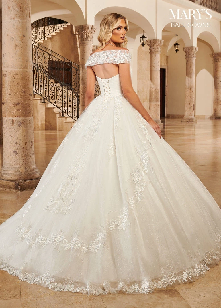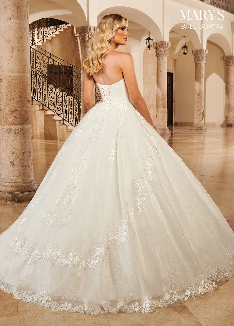 All eyes will be on you in this sweetheart glitter wedding dress by Mary’s Bridal Ball Gowns Collection MB6098. Glitter tulle ball gown features a strapless sweetheart neckline, detachable shoulder straps, pleating detail, lace applique, lace-up back closure, sweep train, and bolero jacket.