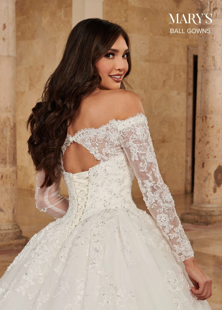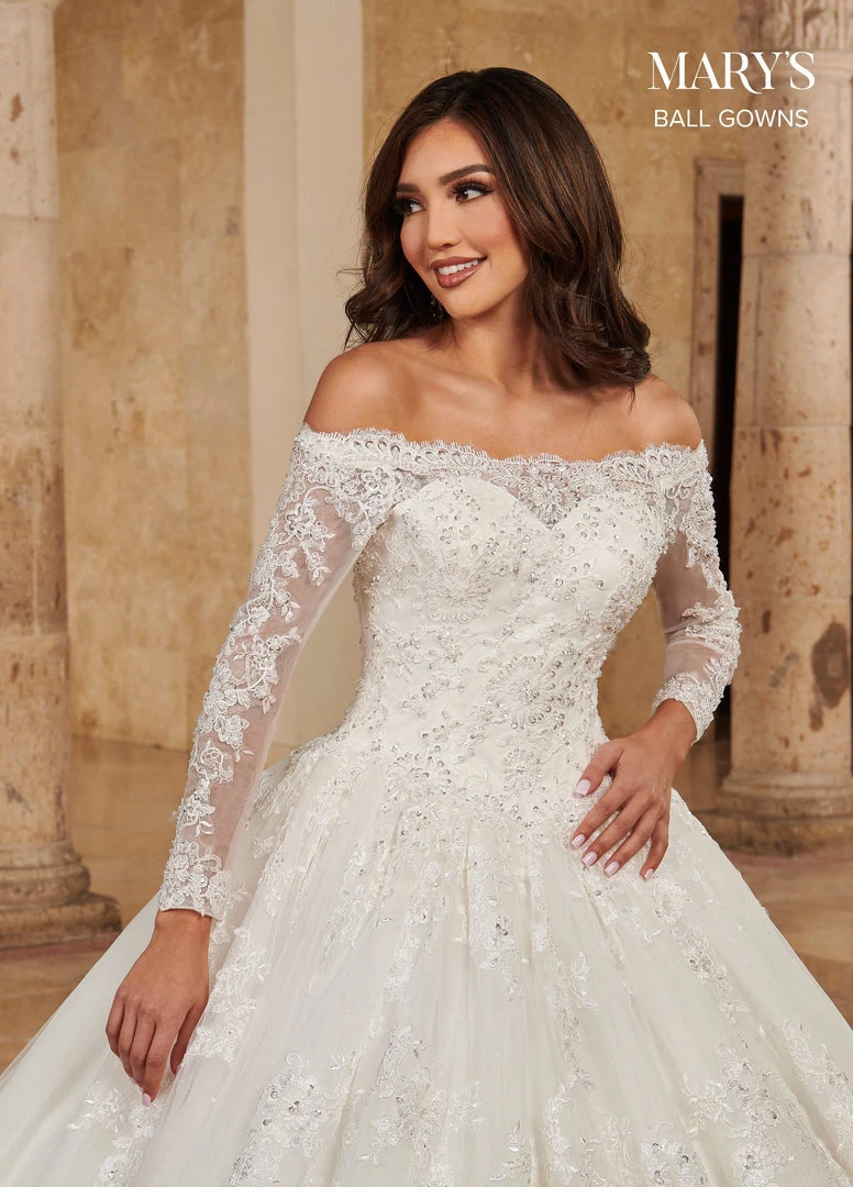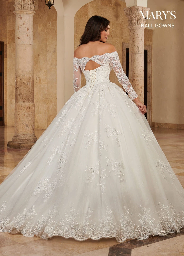 All eyes will be on you in this off shoulder long-sleeve wedding dress by Mary’s Bridal Ball Gowns Collection MB6089. Dramatic tulle bridal dress with an off-the-shoulder neckline, sheer illusion full length sleeves and a back keyhole. The entire gown glimmers throughout and finishes with a lace up back closure and a sweep train.