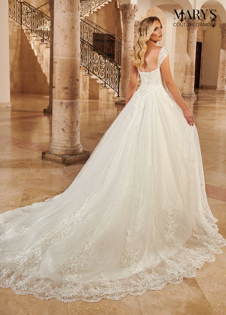 Shimmer under the stars in this long cap sleeve wedding dress with A-line skirt by Mary’s Bridal Couture D’amour Collection MB4123. Eye-catching tulle wedding/bridal dress with a scoop neckline, detachable cap sleeves, and adjustable straps with lace-up back. The bodice and skirt have been accented with crystal beaded lace applique, and a matching lace border at the hem. The gown finishes with a captivating chapel length train.