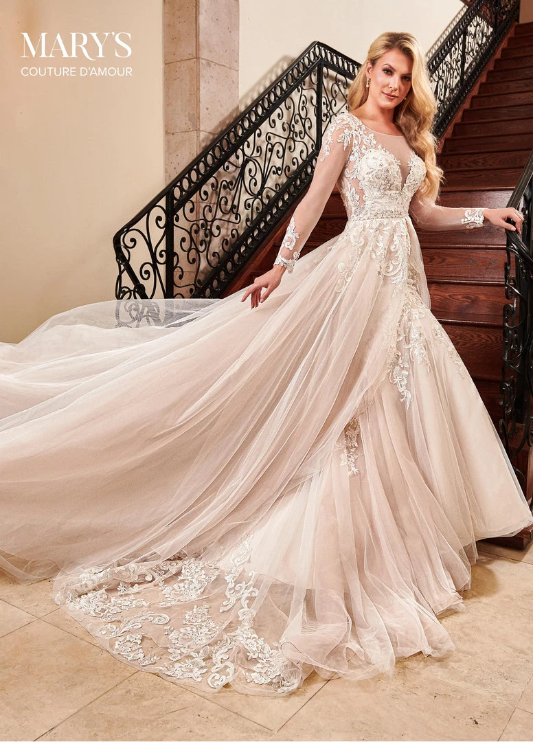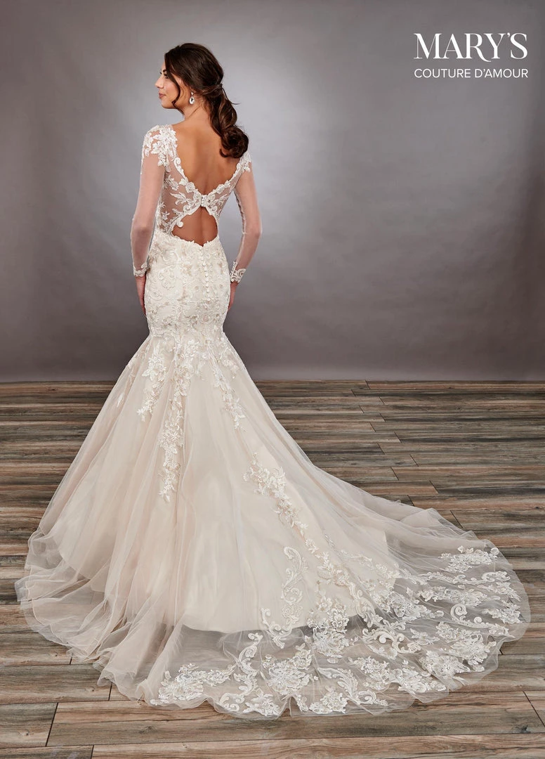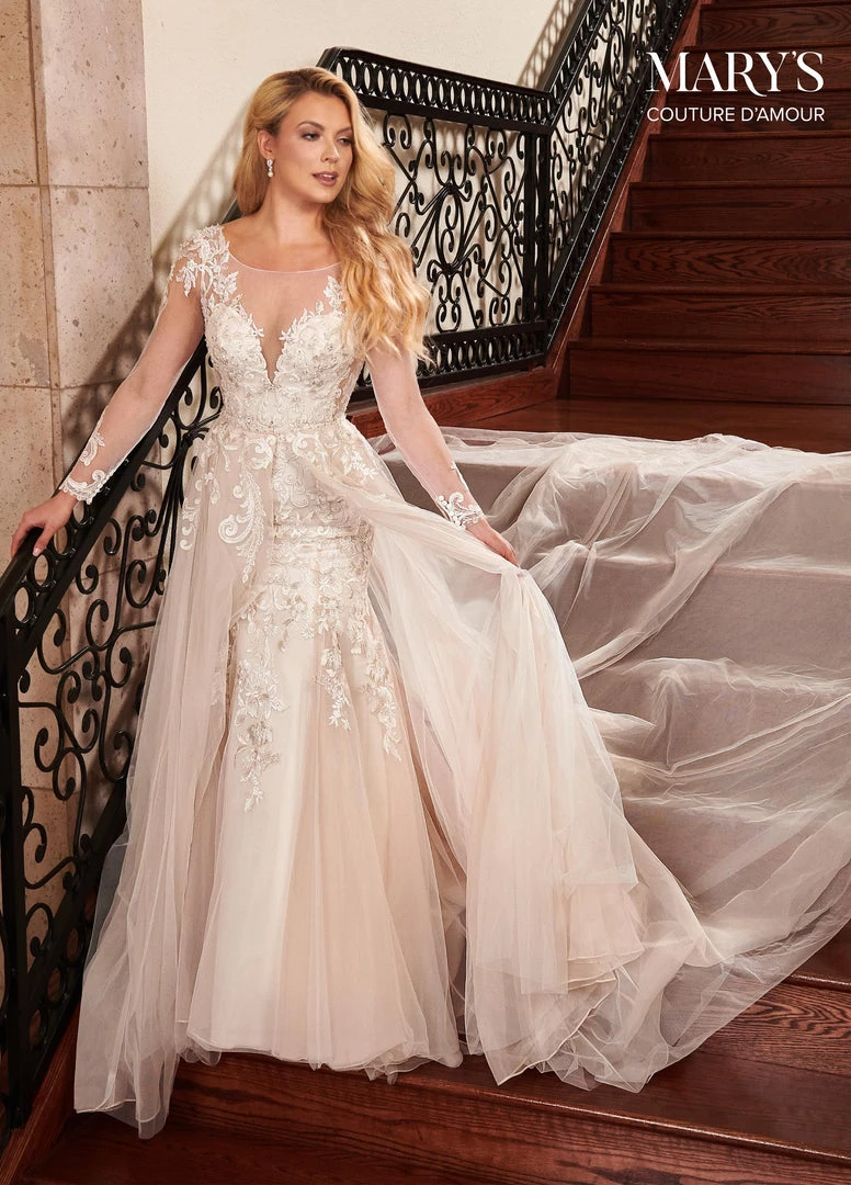 Make lasting memories in this sheer long sleeve wedding dress with mermaid skirt by Mary’s Bridal Couture D’amour Collection MB4081. Timeless fit and flare lace applique wedding/bridal dress with sheer full length sleeves, a plunging front neckline and romantic back keyhole. The gown features a detachable semi cathedral tulle overlay train with a crystal beaded waistband with button closure. The matching overskirt is included.