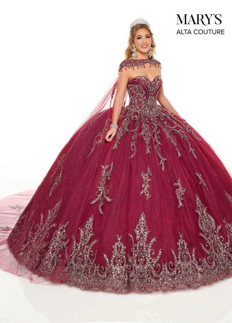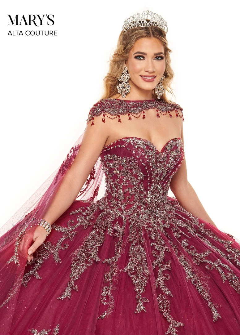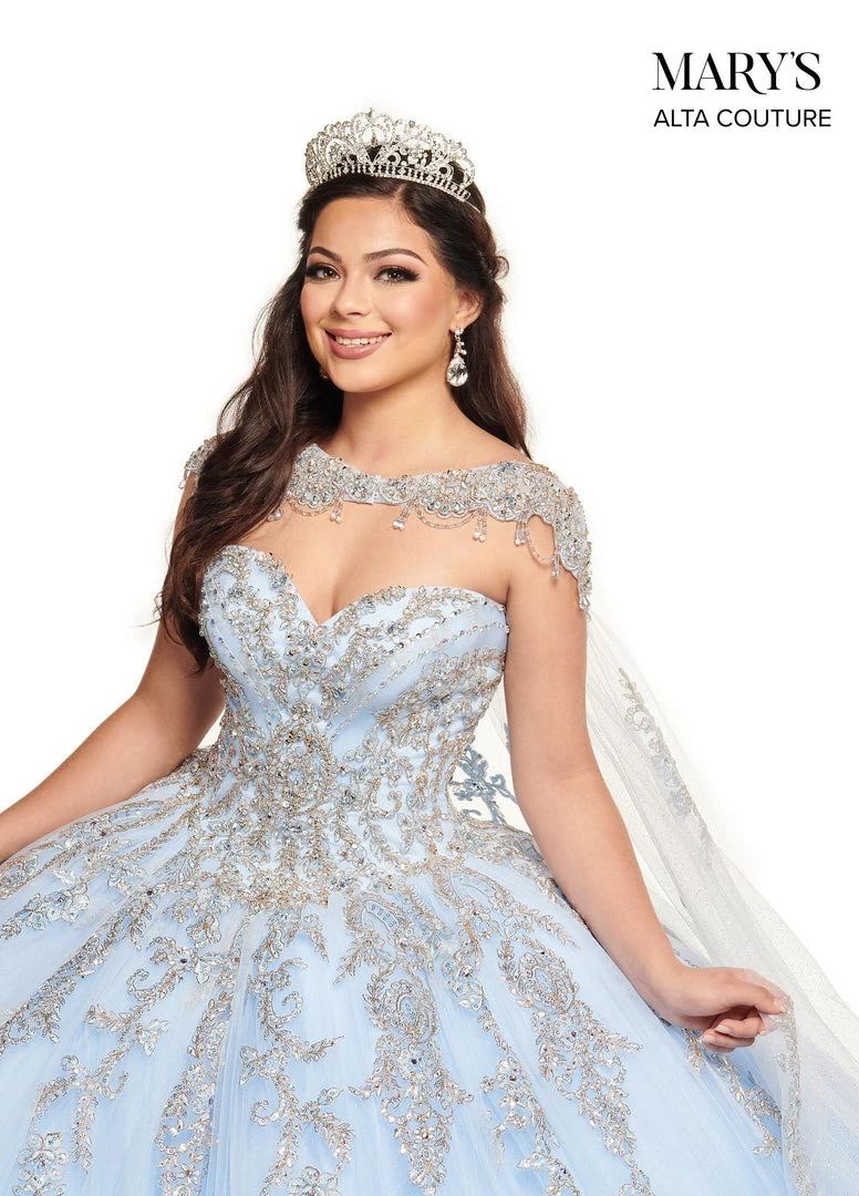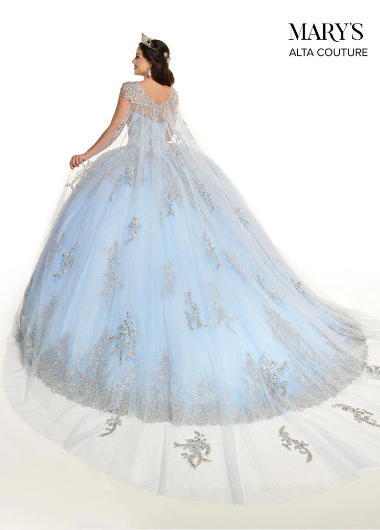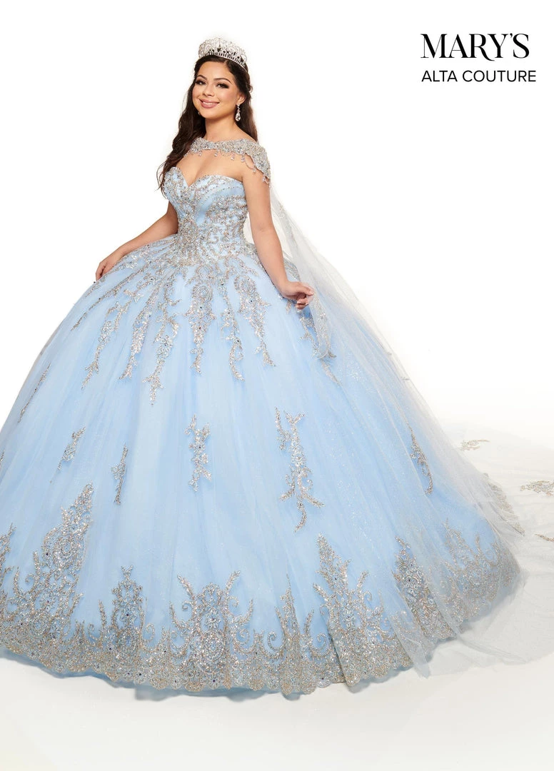 Make a grand entrance in this long strapless sweetheart dress with A-line glitter skirt by Mary’s Bridal Alta Couture MQ3059.Ā Strapless glitter tulle ball gown with a sweetheart neckline and delicate floral embroidery accenting the bodice and skirt. The gown features a basque waistline, corset back, trailing embroidery, chapel train, and a full embroidered hem. The matching detachable cape is included.