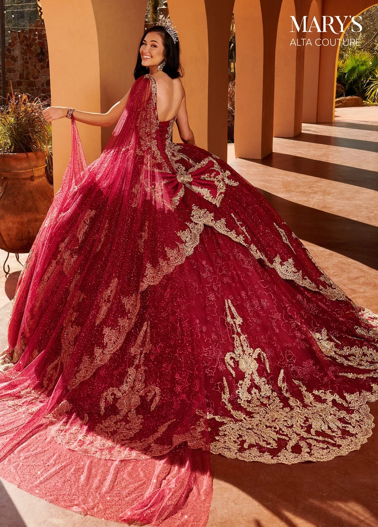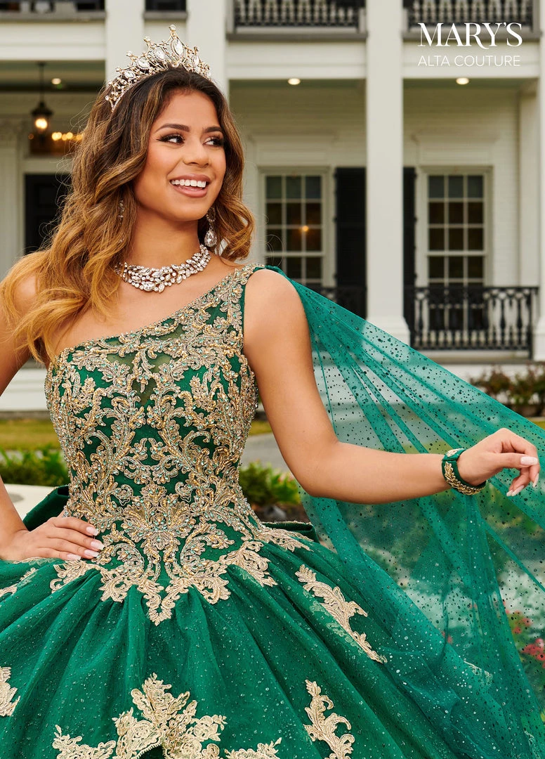 You’ll love twirling around in this one shoulder applique long sleeveless dress with A-line skirt by Mary’s Bridal Alta Couture MQ3097. This glitter tulle one shoulder ball gown features detailed embroidery with lace applique, beads, skirt overlay, bow detail on the back, lace-up closure, and scallop sweep train. Detachable streamer and bolero cape are included.