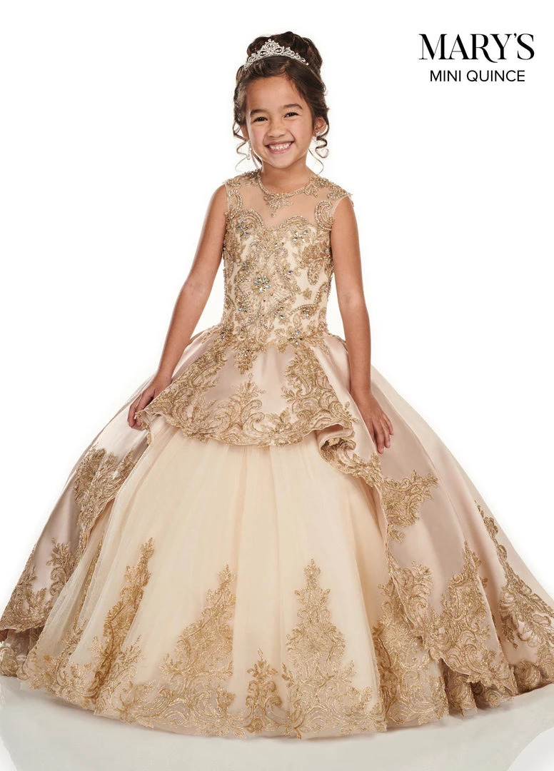 - This dress is available in matching little girl’s sizes! To order a matching girl’s dress, please visit: https://www.abcfashion.net/products/girls-long-gold-applique-illusion-dress-by-marys-bridal-mq4014