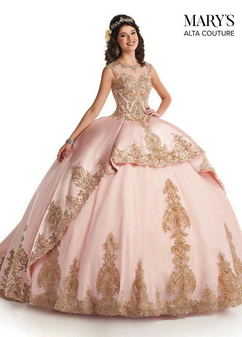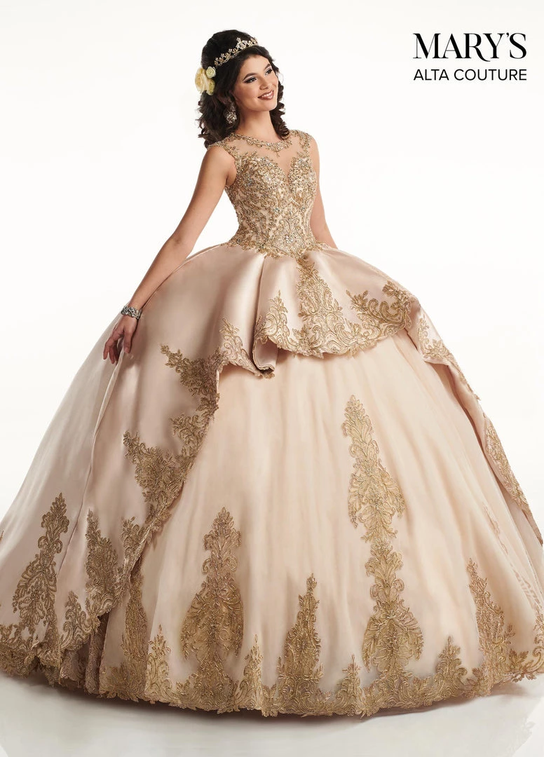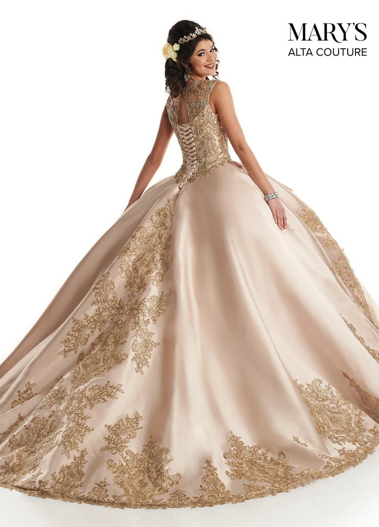 Impress your guests in this gold embroidered long illusion dress with tiered A-line skirt by Mary’s Bridal Alta Couture MQ3034. Royalty inspired mikado and tulle ball gown fully embellished with gold embroidery and sparkling crystal beading. The gown features a sheer sweetheart neckline, sheer cap sleeves, and a lace up back closure. The full chapel length overlay train has been embellished throughout. The matching cape is included.