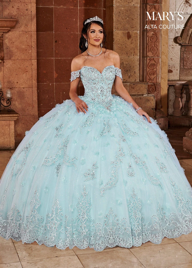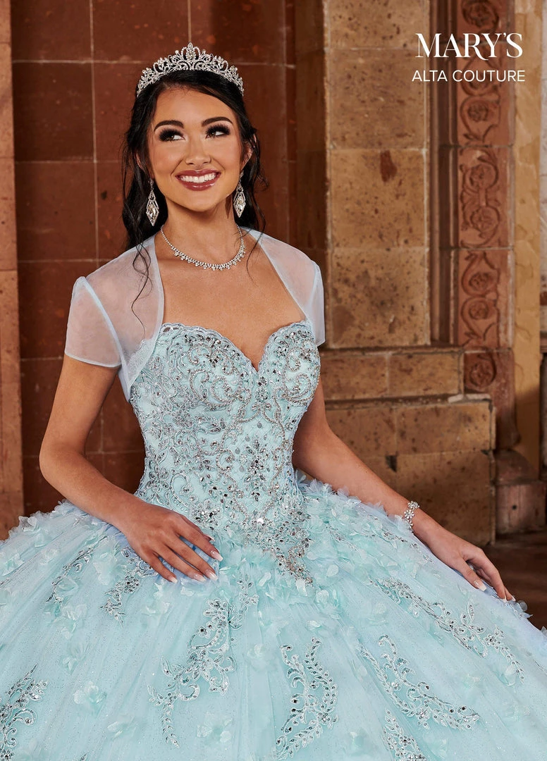 Have a magical moment in this lace appliqued long sweetheart dress with A-line skirt by Mary’s Bridal Alta Couture MQ3065. Full glitter tulle ball gown with a strapless sweetheart neckline, basque waistline and detachable applique sleeves. The entire gown features delicate lace applique, 3D floral accents and sparkling hand beading. The gown finishes with a corset back and a scalloped hem. The matching bolero jacket is included.
