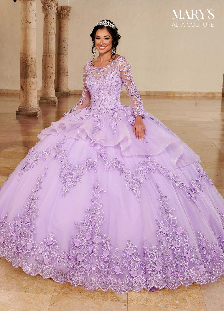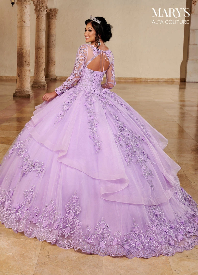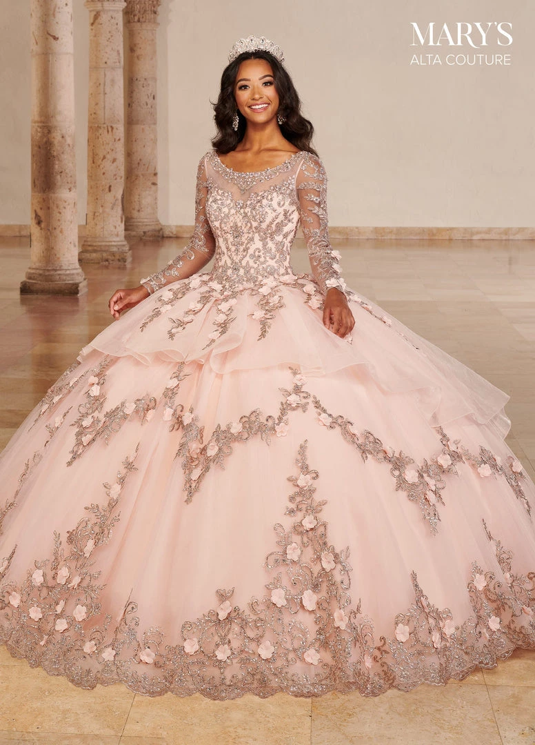 Look modern chic in this embellished long sleeve dress with A-line skirt by Mary’s Bridal Alta Couture MQ3076. This tulle quinceanera ball gown features a scoop neckline, fitted sheer long sleeves, lace applique, 3D flowers, keyhole open back, lace-up closure, 2-tiered skirt, and a sweep train.