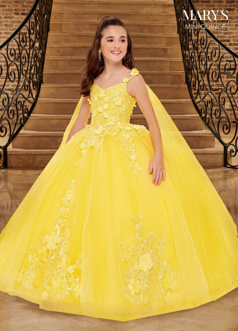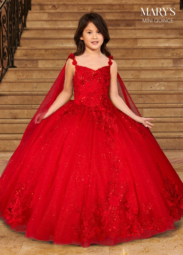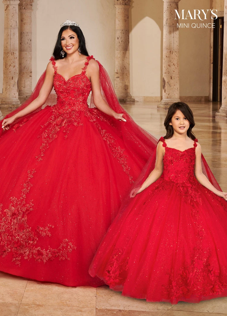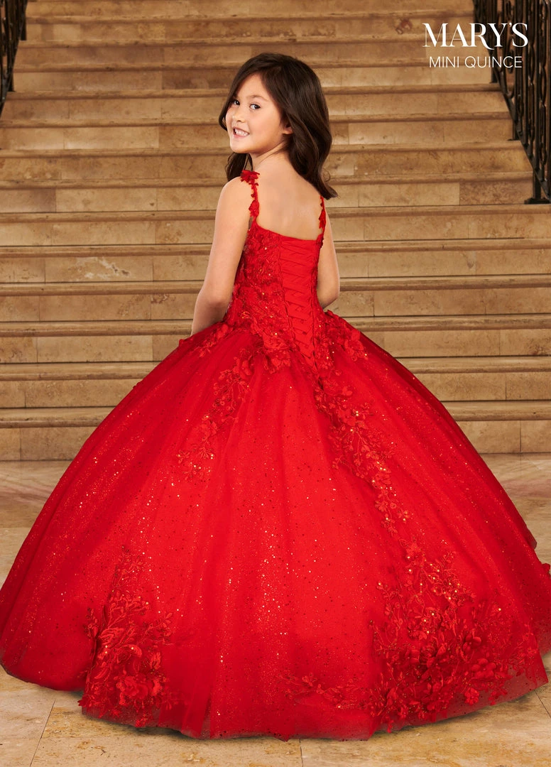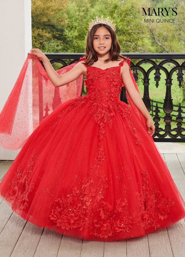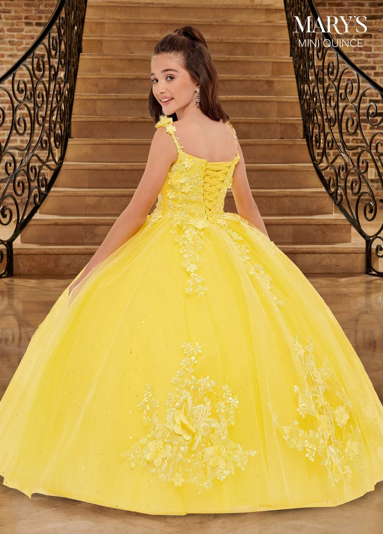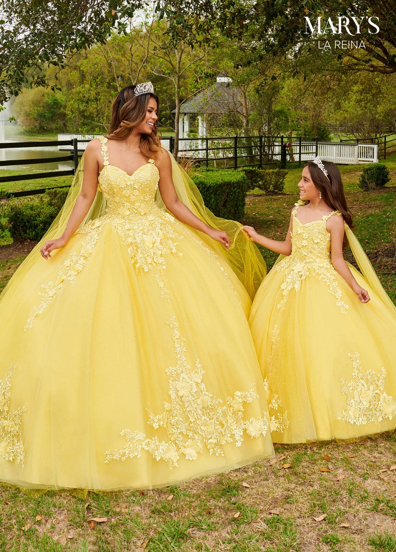 Your sweet girl will love twirling around in this 3D floral applique long sleeveless dress with A-line skirt by Mary’s Bridal Mini Quince MQ4031. This glitter tulle mini quince ball gown features a sweetheart neckline, lace-applique, 3D flowers, detachable streamers, and lace-up back closure. This dress matches quinceanera gown MQ2148.