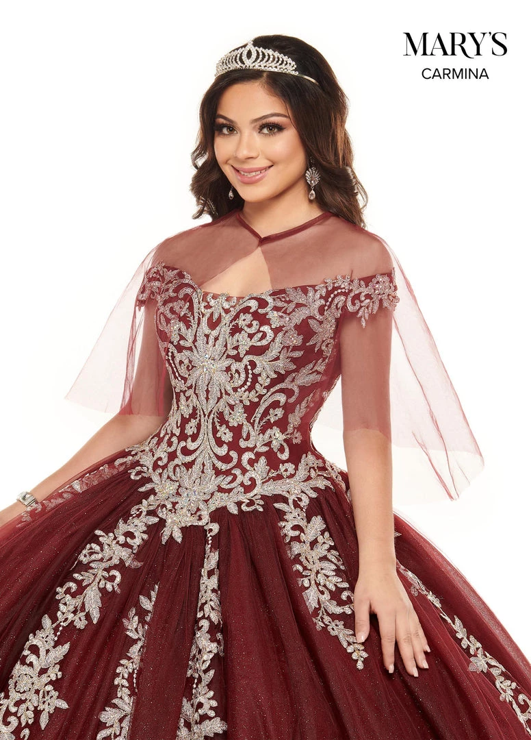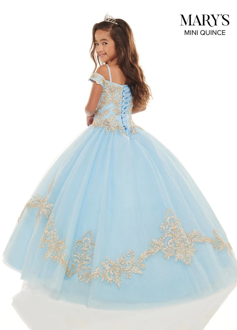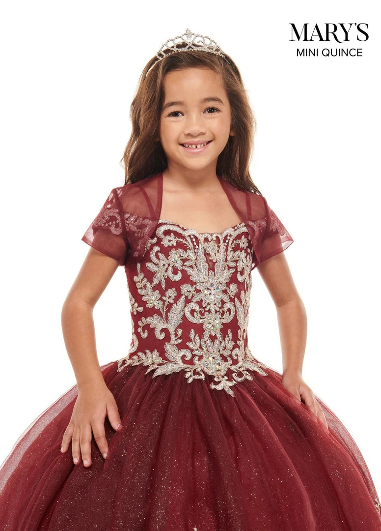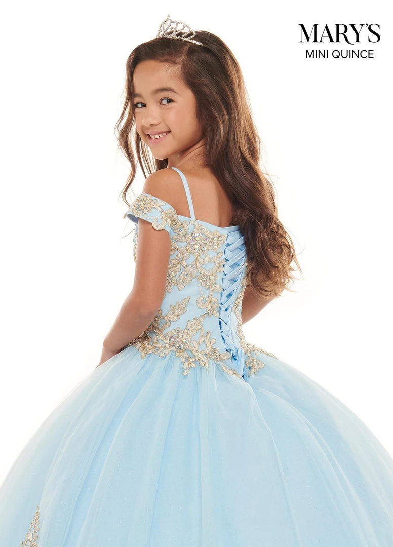 Your sweet girl is sure to beam with joy in this lace applique long cold shoulder dress with A-line glitter skirt by Mary’s Bridal Mini Quince MQ4023. Tulle ball gown with an off-the-shoulder sweetheart neckline, thin straps, metallic embroidery, crystal beading and a basque waistline. The gown features matching skirt embroidery, corset back and a sweep train. The matching tulle jacket is included.