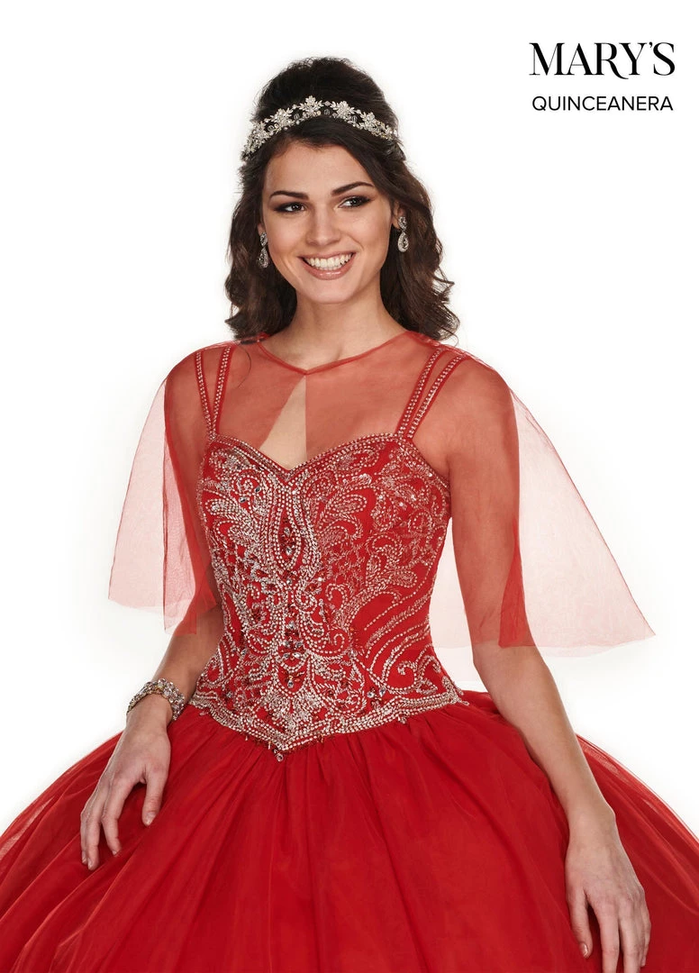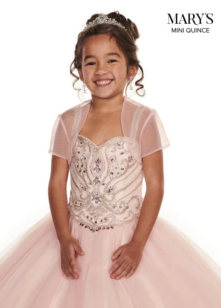 Your sweet girl will beam with joy in this beaded long sleeveless dress with A-line skirt by Mary’s Bridal Mini Quince MQ4011. Mesmerizing tulle ball gown with a sweetheart neckline, delicately beaded straps, and a fully crystallized bodice. The gown features a lace up back closure, sweep train, and a matching bolero jacket.