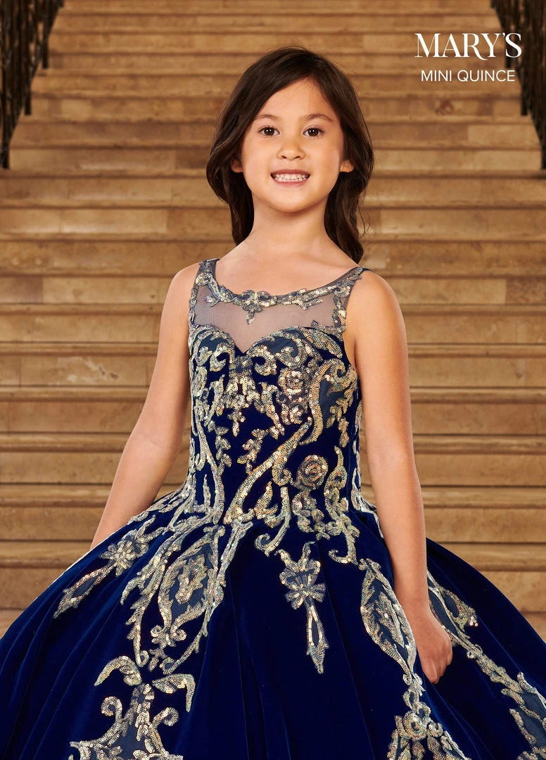 Your sweet girl will be the center of attention in this sequined applique long sleeveless velvet dress with A-line skirt by Mary’s Bridal Mini Quince MQ4028. Luxe velvet ball gown with sheer neckline and sequin applique throughout. The gown features a fully pleated skirt and a corset back. Matching MQ3067.