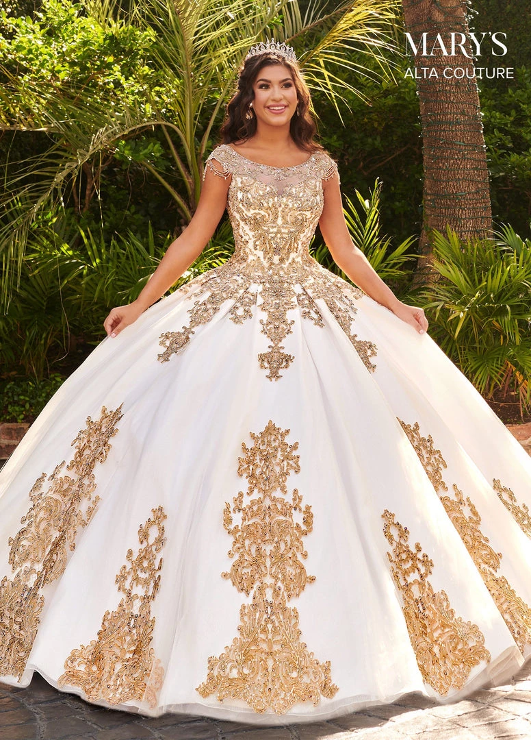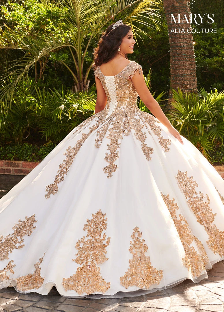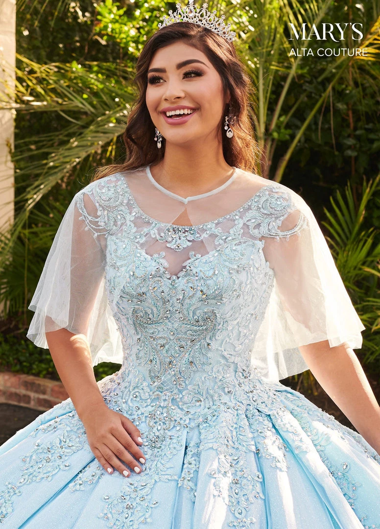 Dance the night away in this applique long illusion cap sleeve dress with A-line skirt by Mary’s Bridal Alta Couture MQ3055. Tulle and glitter organza ball gown with a sheer cap sleeve yoke, sweetheart neckline and a basque waistline. The bodice and skirt have been embellished with beautiful embroidery, crystal hand beading and draped beaded fringe. The gown finishes with a corset back and a sweep train. The matching cape is included.