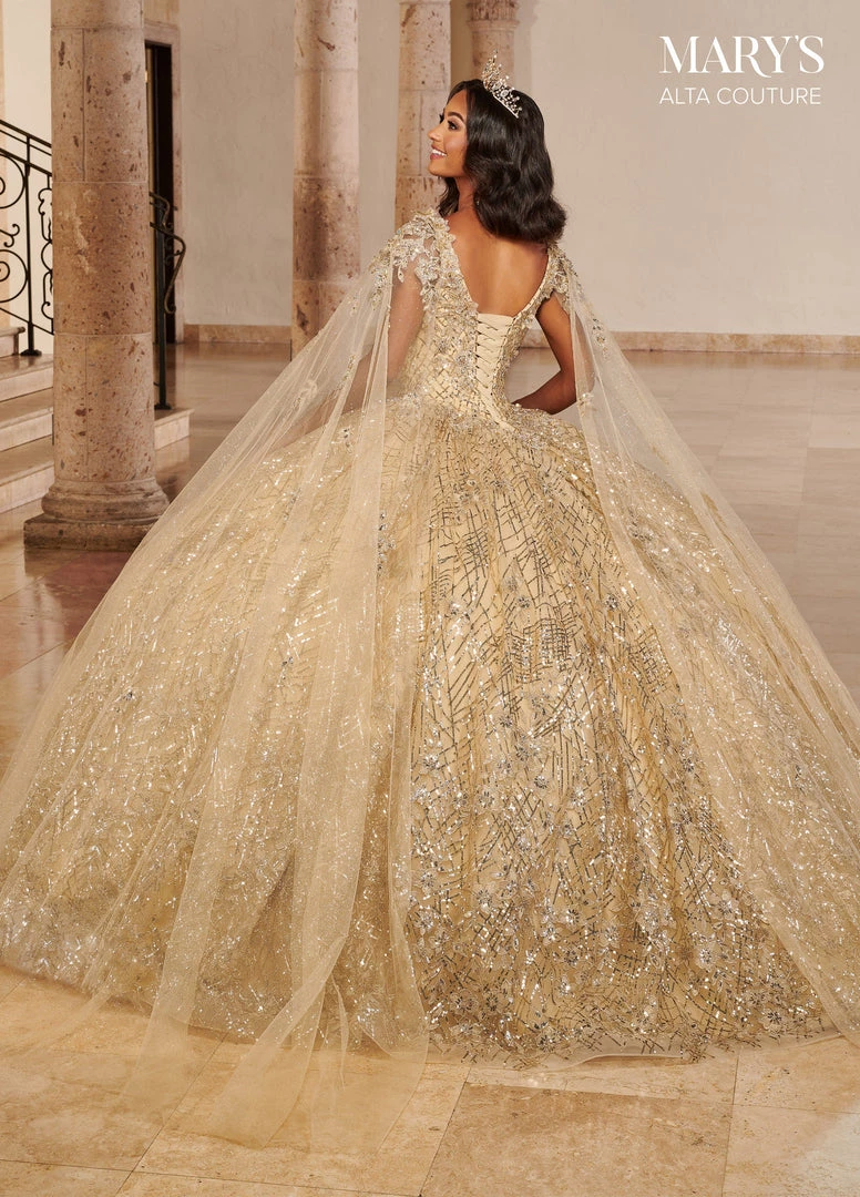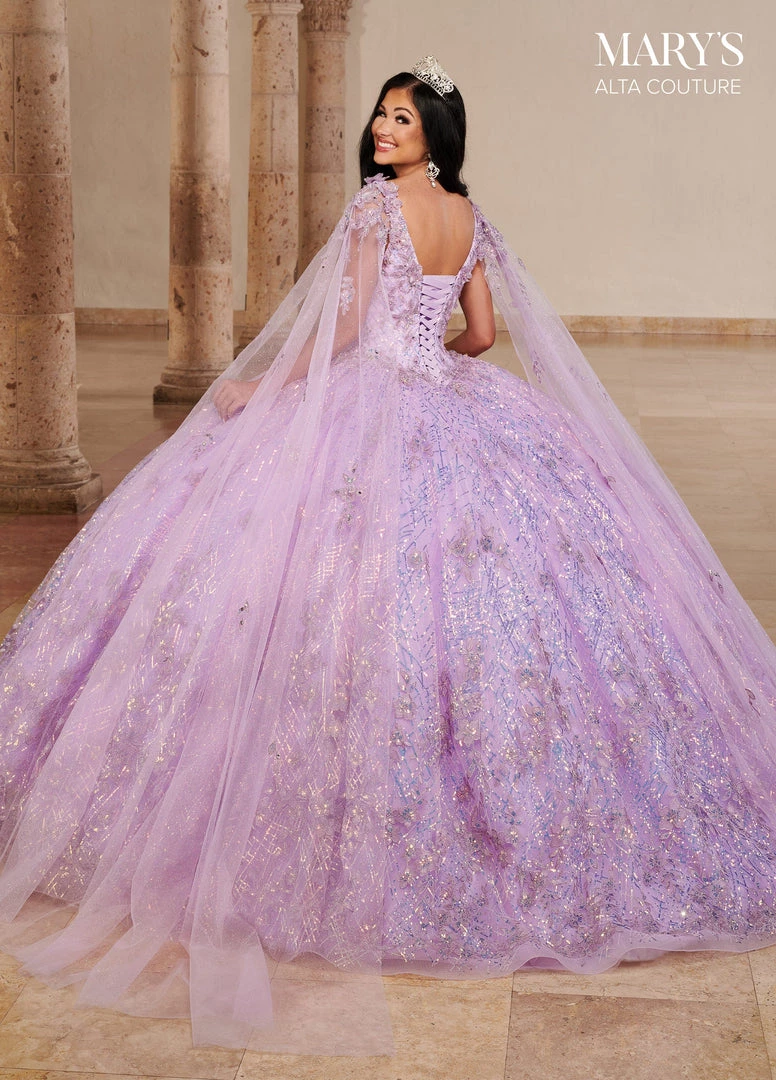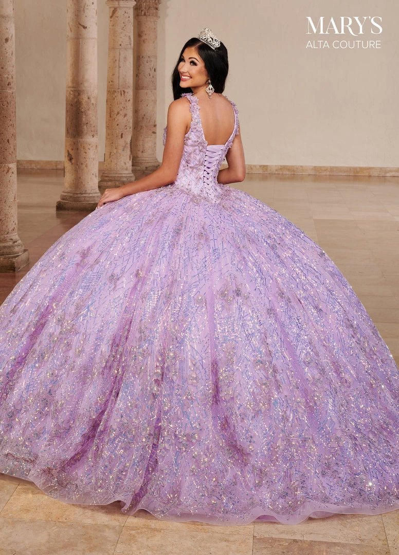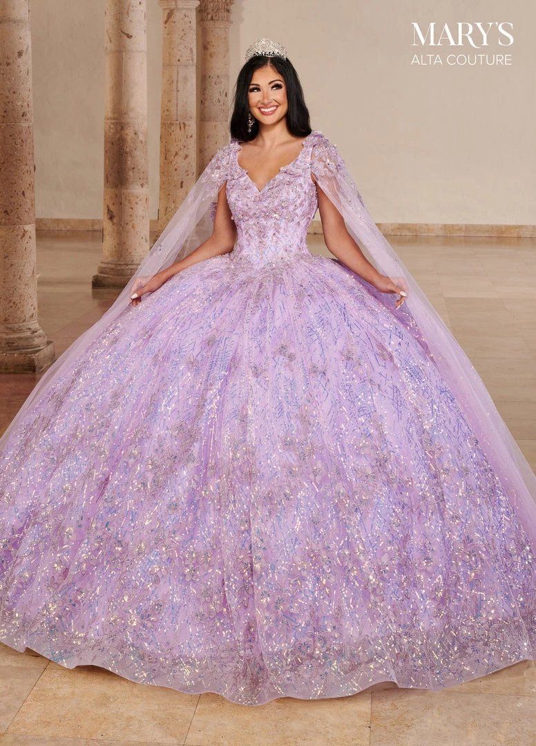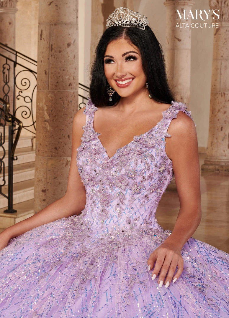 Dazzle the room in this long sleeveless dress with A-line skirt by Mary’s Bridal Alta Couture MQ3082. This glitter tulle and sequin quinceanera ball gown features a V-neckline, 3D flowers, applique, beading detail, detachable streamers, lace-up back closure, sweep train, and a bolero jacket.