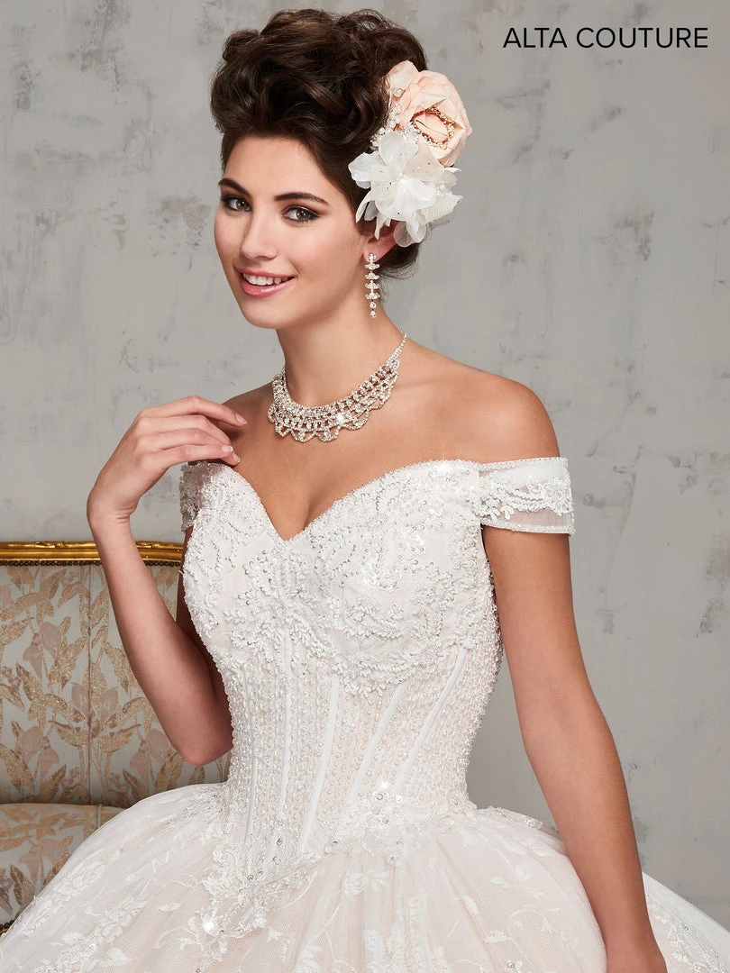 You’ll feel like you’re in a fairy tale in this off-the-shoulder lace ball gown by Mary’s Bridal Alta Couture MQ3001 This off shoulder tulle over lace quinceanera dress features off shoulder sweetheart neckline, lace appliques, beaded corset bodice, basque waistline, lace-up closure, and chapel train.