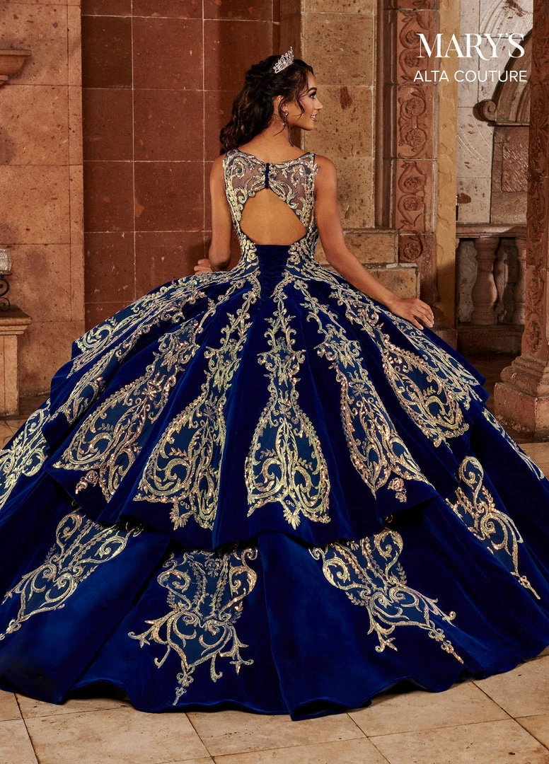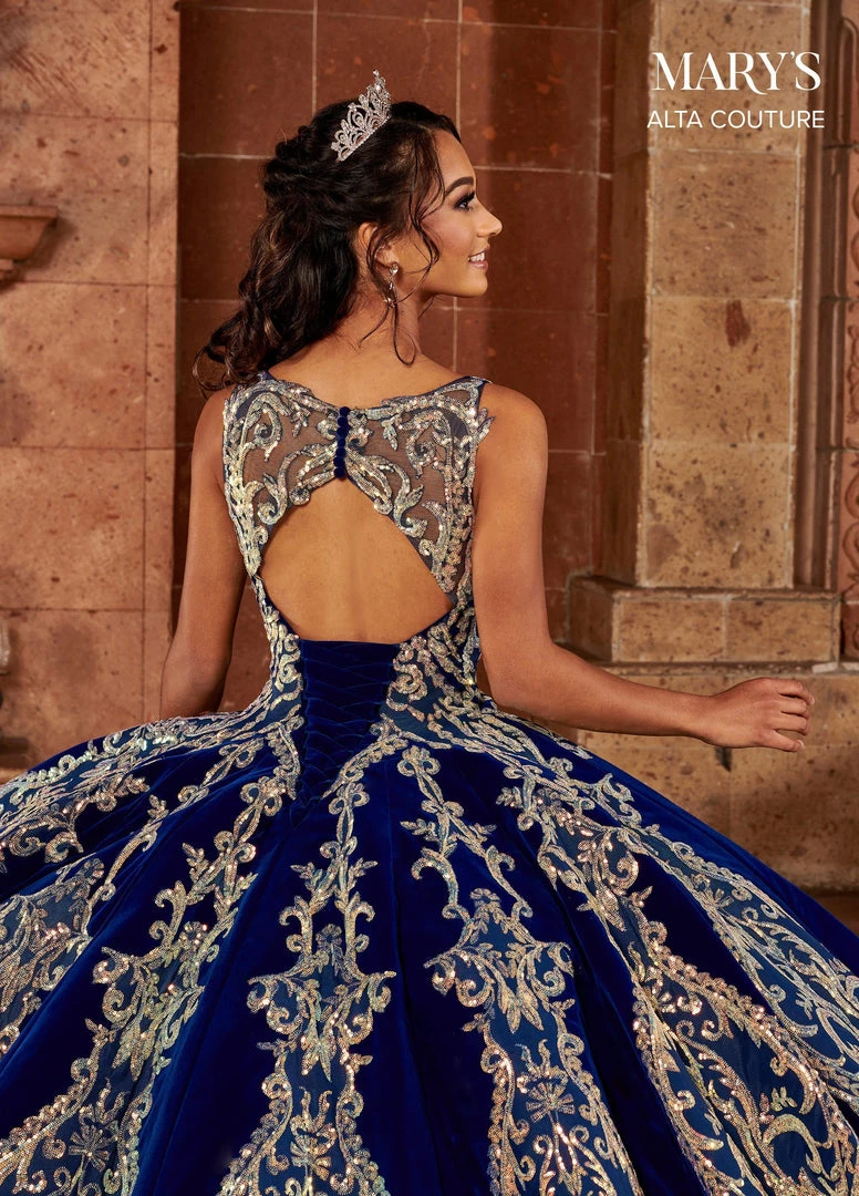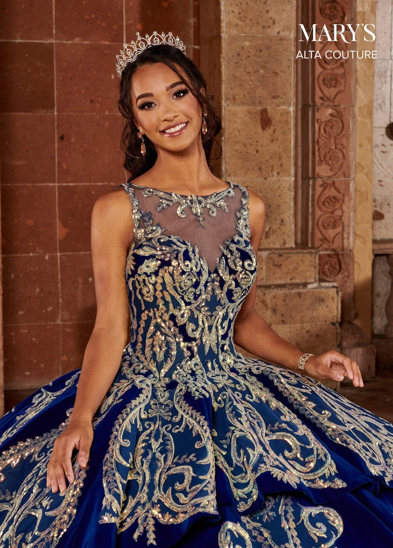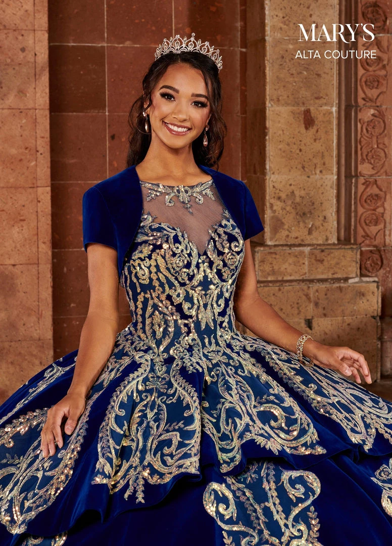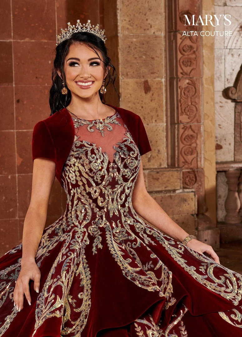Look picture-perfect in this sequined long sleeveless illusion dress with A-line skirt by Mary’s Bridal Alta Couture MQ3067. Timeless luxe velvet ball gown with a sheer neckline, keyhole back and basque waistline. The bodice and tier skirt are beautifully embellished with metallic sequin applique and delicate cut-work. The gown features a corset back and sweep train. The matching bolero jacket is included. Matching MQ4028.