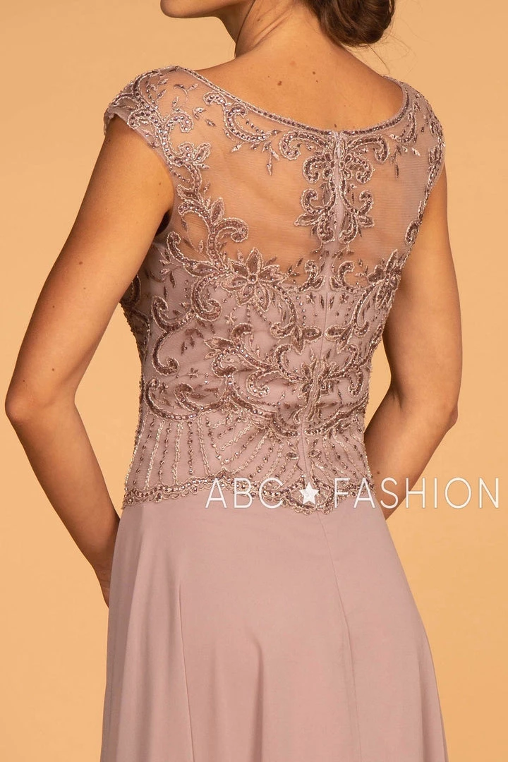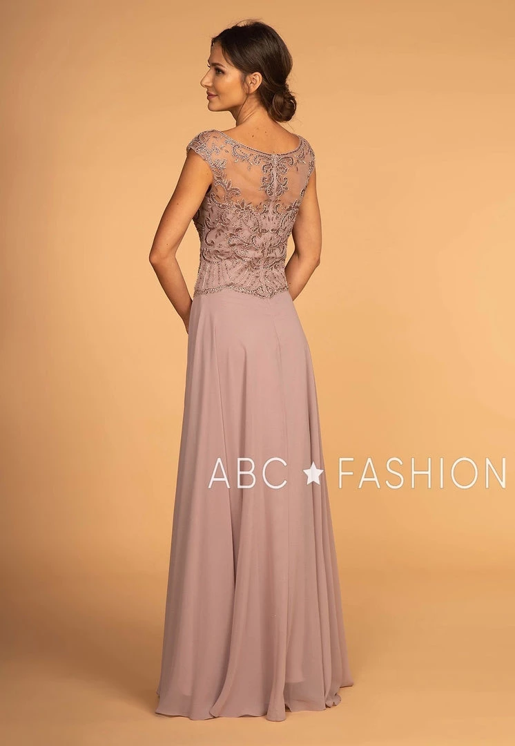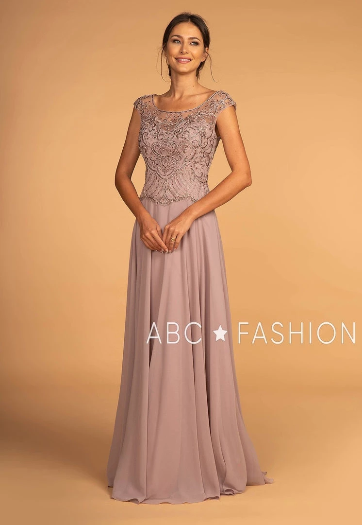 Make a lasting impression in this long mauve cap sleeve gown with jeweled illusion bodice by Elizabeth K GL2523. This long evening dress features an illusion sweetheart bodice adorned with beautiful jeweled embroidery that cascades to the waistline, embellished sheer cap sleeves, a floor length A-line chiffon skirt, and a zipper closure. Affordably priced at $280, this dress is perfect for any formal event and will keep you on budget!