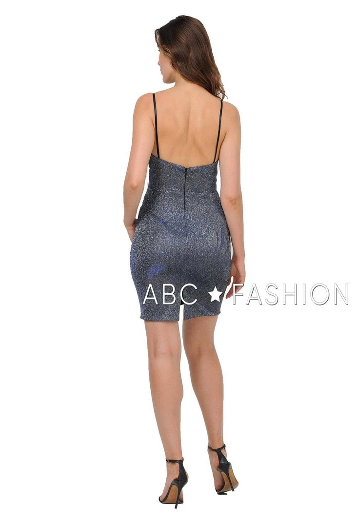 Dazzle the room in this metallic glitter short spaghetti strap cocktail dress with open back by Poly USA 8218. Stunning short spaghetti strap metallic dress with deep V-neckline, flirty open back, and back zipper closure. Affordably priced under $100, this short party dress is perfect for any semi-formal event and will keep you on budget!