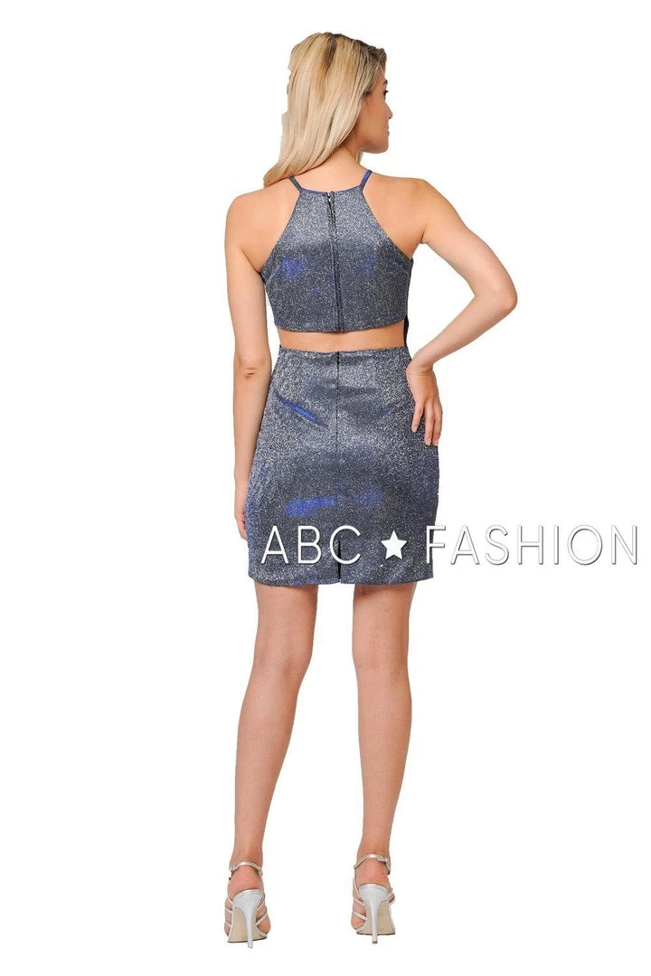 Show off your figure in this metallic glitter short high-neck cocktail dress with cutout back by Poly USA 8214. Glamorous high-neck metallic short dress with beautiful back cut-out and zipper closure. Affordably priced under $100, this short party dress is perfect for any semi-formal event and will keep you on budget!