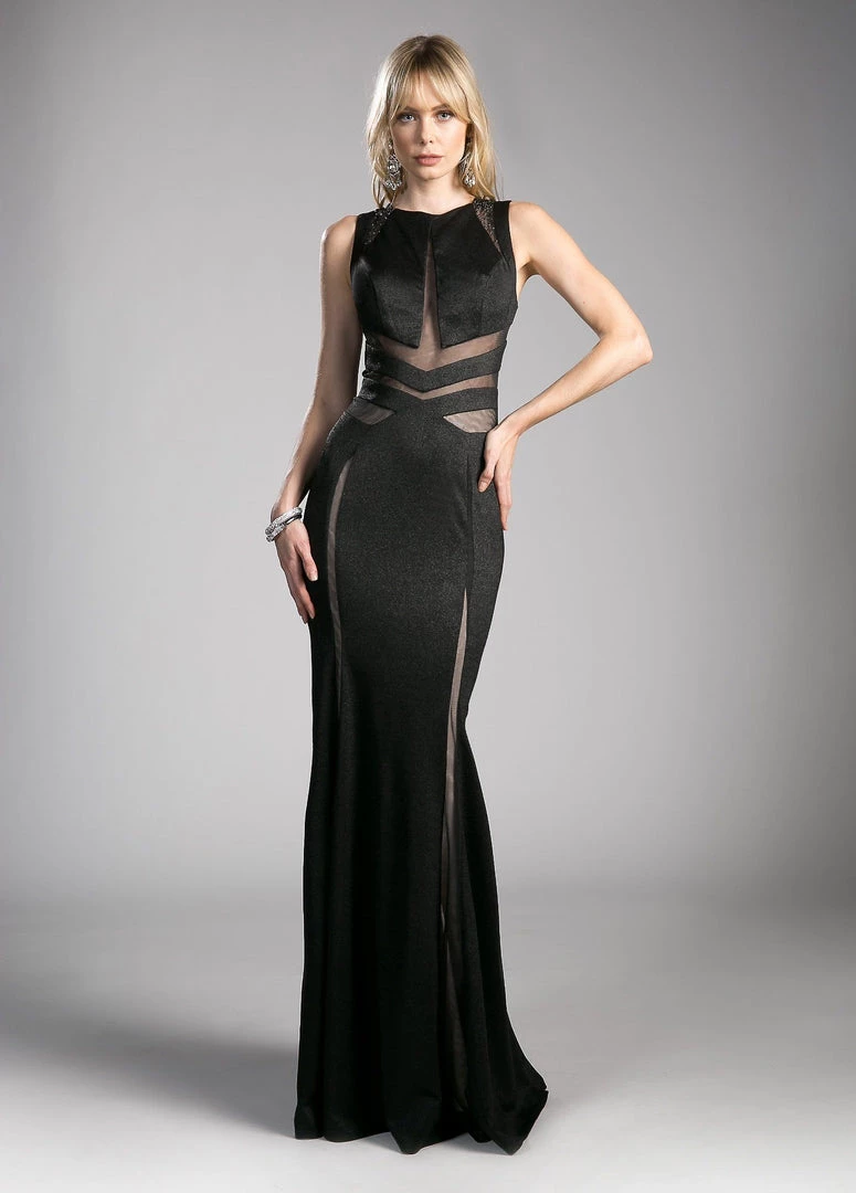 Dance the night away in this long sleeveless metallic knit fitted dress with sheer cut outs by Cinderella Divine 84792. This evening gown features a sleeveless bodice with sheer panel cut outs, beaded accents on the wide illusion shoulder straps, enclosed sheer back with cut outs, a floor length form fitting skirt with a small train, and a zipper closure.