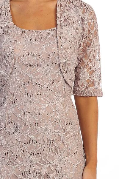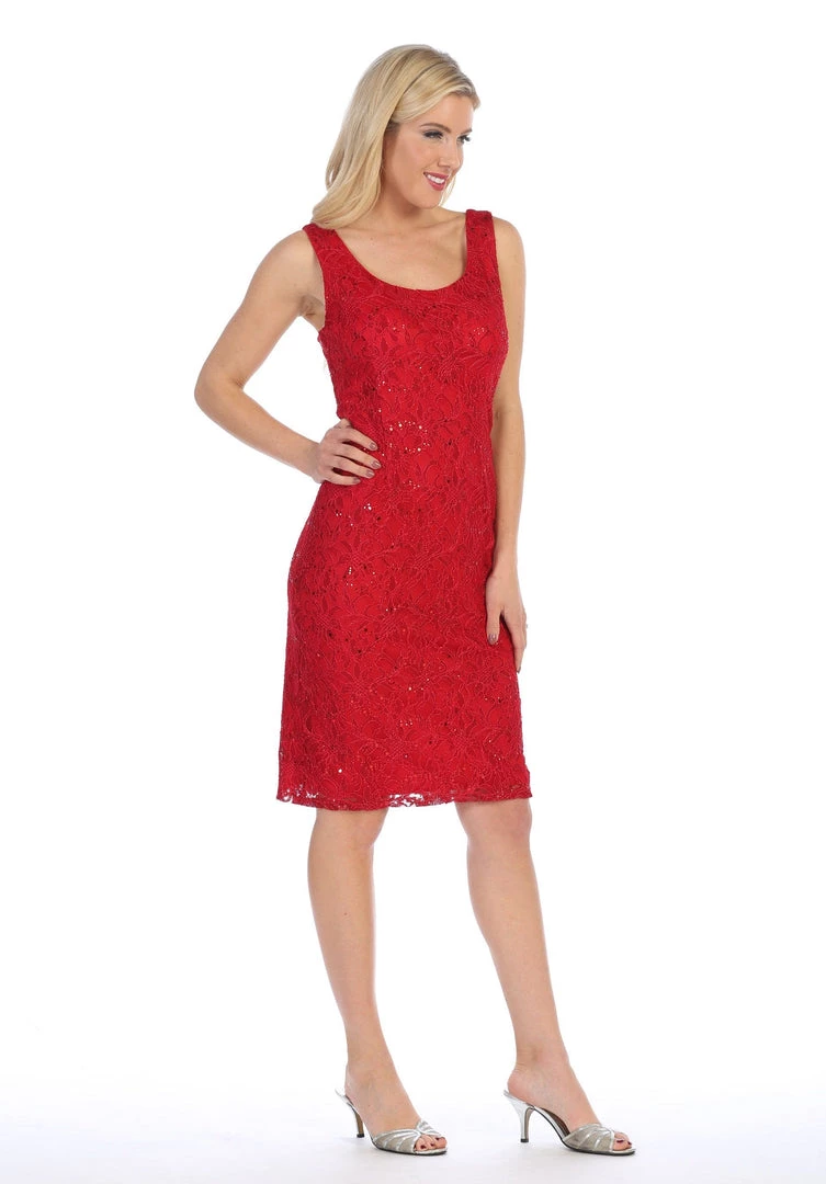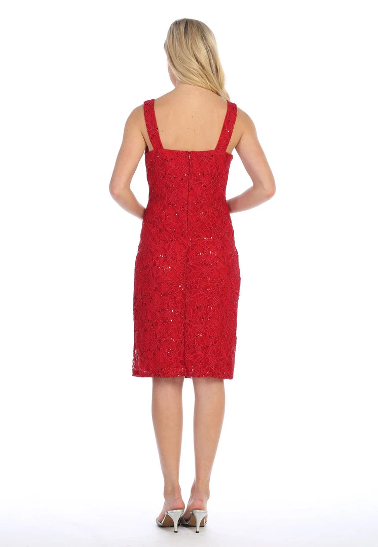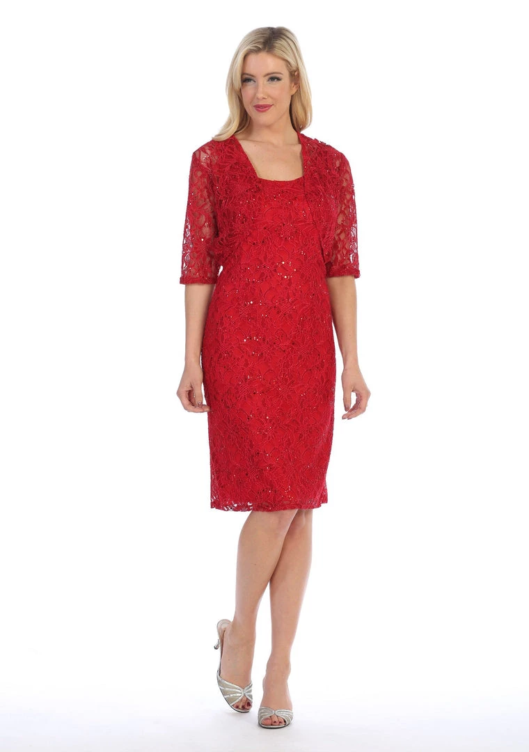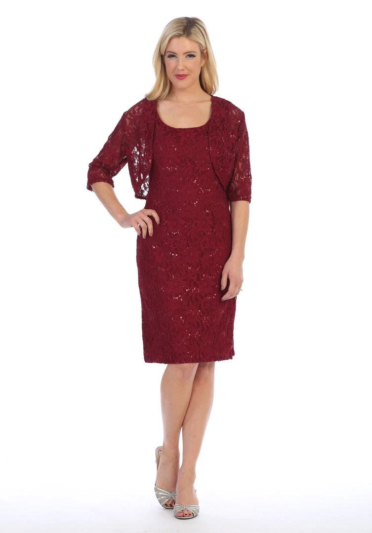 Look modest chic in this knee length lace cocktail dress with matching bolero jacket by Celavie 2462-S. Made out of beaded lace, this beautiful short dress features a sleeveless bodice with a scoop neckline, short A-line skirt that falls at the knees, and a zipper closure. This dress includes a matching bolero jacket with mid-length sleeves. Affordably priced at $119, this short party dress is perfect for any formal event and will keep you on budget!