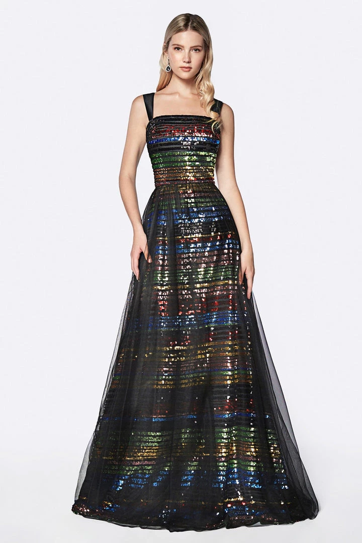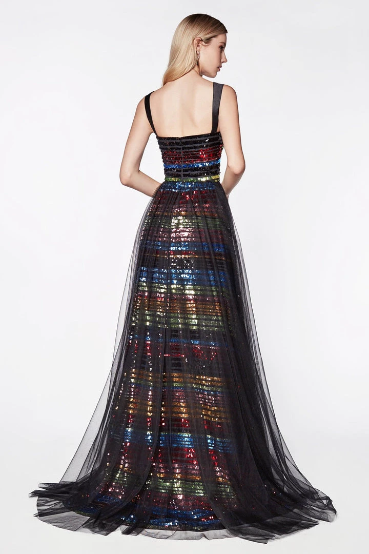 Envision yourself wearing this beautiful rainbow colored long sequined A-line dress by Cinderella Divine CS032. We love this A-line gown with multi color sequin stripes and black tulle over skirt!