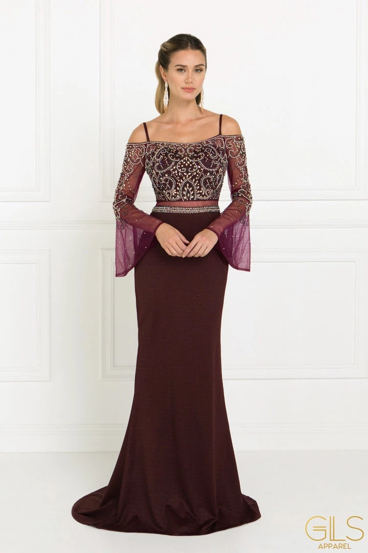 Look and feel beautiful in this long beaded navy blue cold shoulder dress with sheer sleeves by Elizabeth K GL1500. Cold shoulder full length dress with a halter neckline on a mermaid silhouette. Has jewel beaded embroidery details on draped lace sleeves and solid tone bottom skirt. Perfect for any formal event!