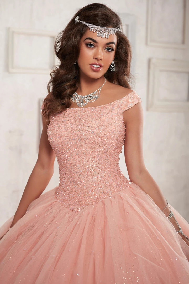 Dazzle the room in this beaded long off the shoulder dress with glitter A-line skirt by House of Wu Quinceanera Collection 26844. Glimmering in showcase fashion is this gorgeous Quinceañera gown with a densely sequined and beaded bodice. The full ball gown skirt splays down in brilliant displays of beaded and sequin tulle layers, with a sparkle tulle layer underneath. This look is finished with a lace-up corset back and a sweep train.