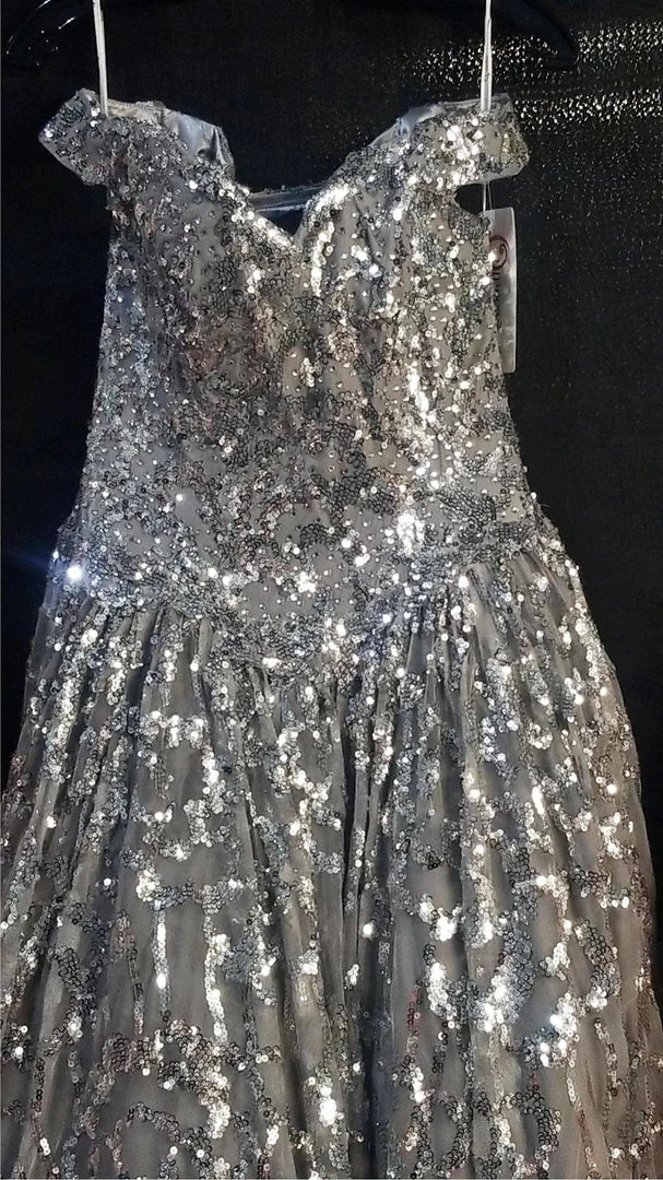 Receive lots of compliments in this long off the shoulder sequin dress with A-line skirt by House of Wu 26919. Sparkle under the stars with this floral sequins ball gown! Cap sleeves softly draped around the shoulders. The bodice is accented with boning for support and structure. This look is finished with a corset back and a gorgeous sweep train.