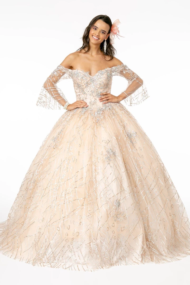 Captivate the room in this long off the shoulder sweetheart glitter dress with A-line skirt by Elizabeth K GL2911. Made out of mesh, this beautiful gown features a beaded off shoulder bodice, embellished sheer bell sleeves, open back, floor length A-line skirt adorned with sparkly glitter print, sweep train, and lace-up corset back.