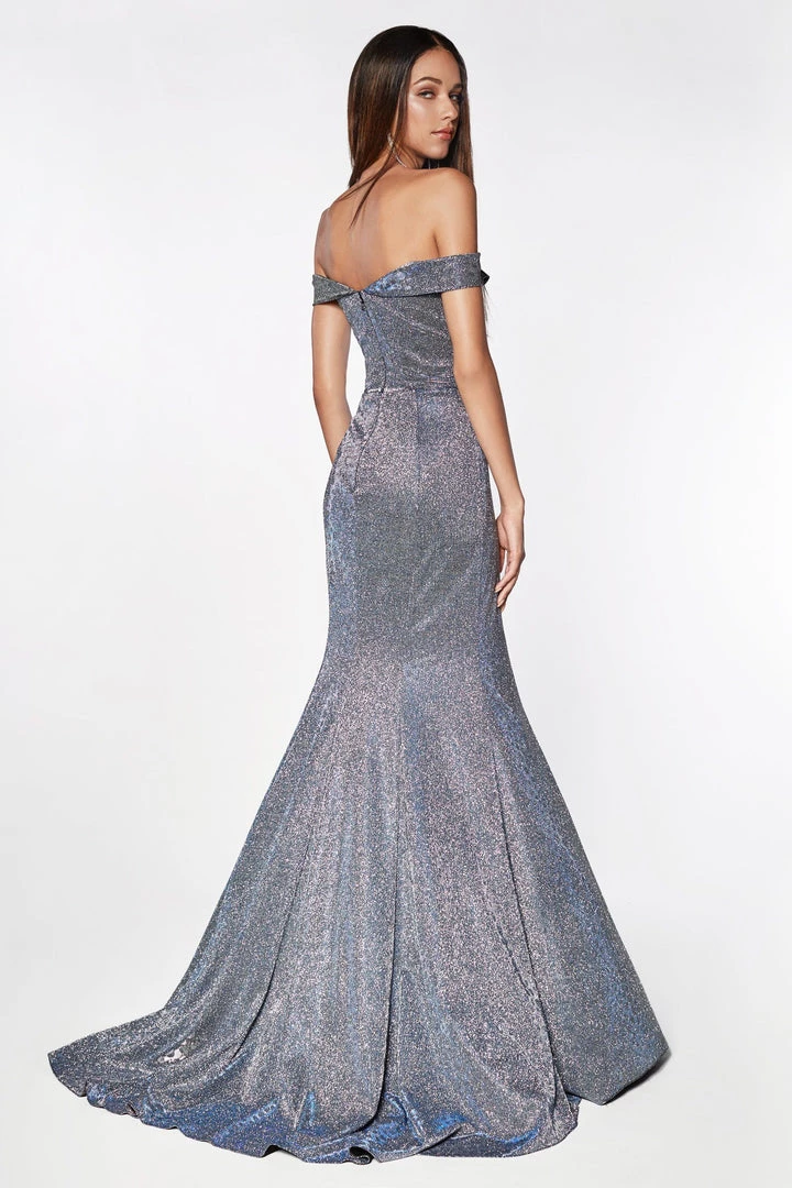 Be selfie-ready in this long off the shoulder metallic glitter dress by Cinderella Divine KC19057. We love this off the shoulder metallic gown with sweetheart neckline and sexy leg slit!