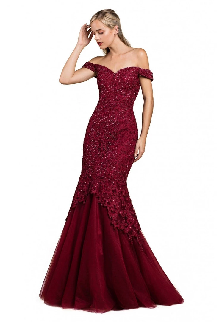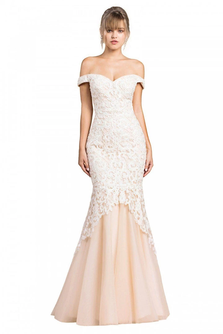 Look picture-perfect this long off the shoulder lace mermaid dress with corset back by Cinderella Divine A0401.